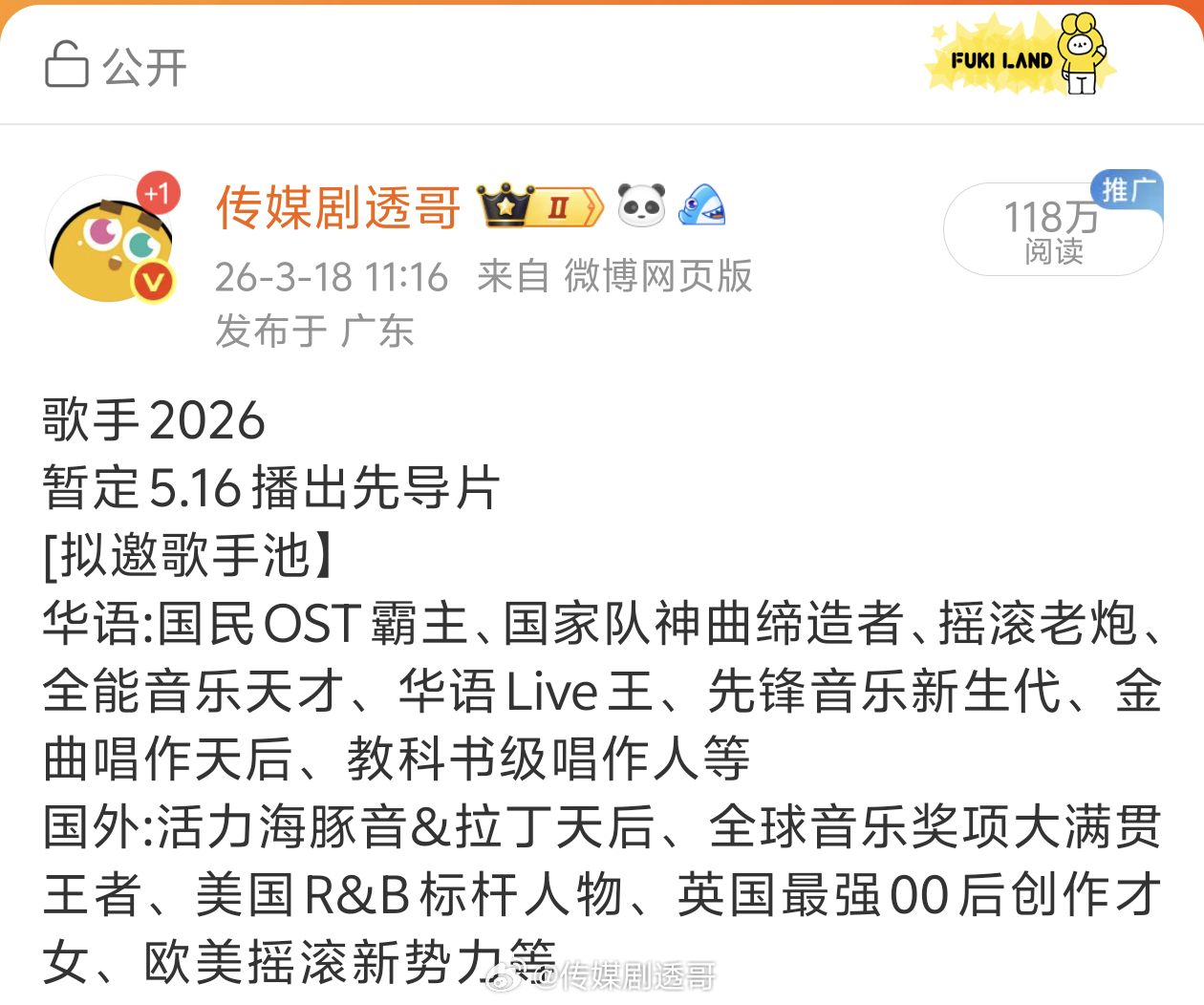 歌手2026拟邀歌手2026拟邀阵容关键词AI解码【华语乐坛】1. 国民OST霸主——张碧晨2. 国家队神曲缔造者——谭维维3. 摇滚老炮——崔健 / 汪峰4. 全能音乐天才——王力宏5. 华语Live王——张杰6. 先锋音乐新生代——华晨宇7. 金曲唱作天后——蔡健雅 / 孙燕姿8. 教科书级唱作人——李荣浩 / 周杰伦【国外乐坛】1. 活力海豚音&拉丁天后——Shakira(夏奇拉)2. 全球音乐奖项大满贯王者——Beyoncé(碧昂丝)/ Michael Jackson3. 美国R&B标杆人物——Usher / Whitney Houston / Mariah Carey4. 英国最强00后创作才女——Olivia Dean / Arlo Parks(最贴合00后)5. 欧美摇滚新势力——Olivia Rodrigo(带摇滚元素)