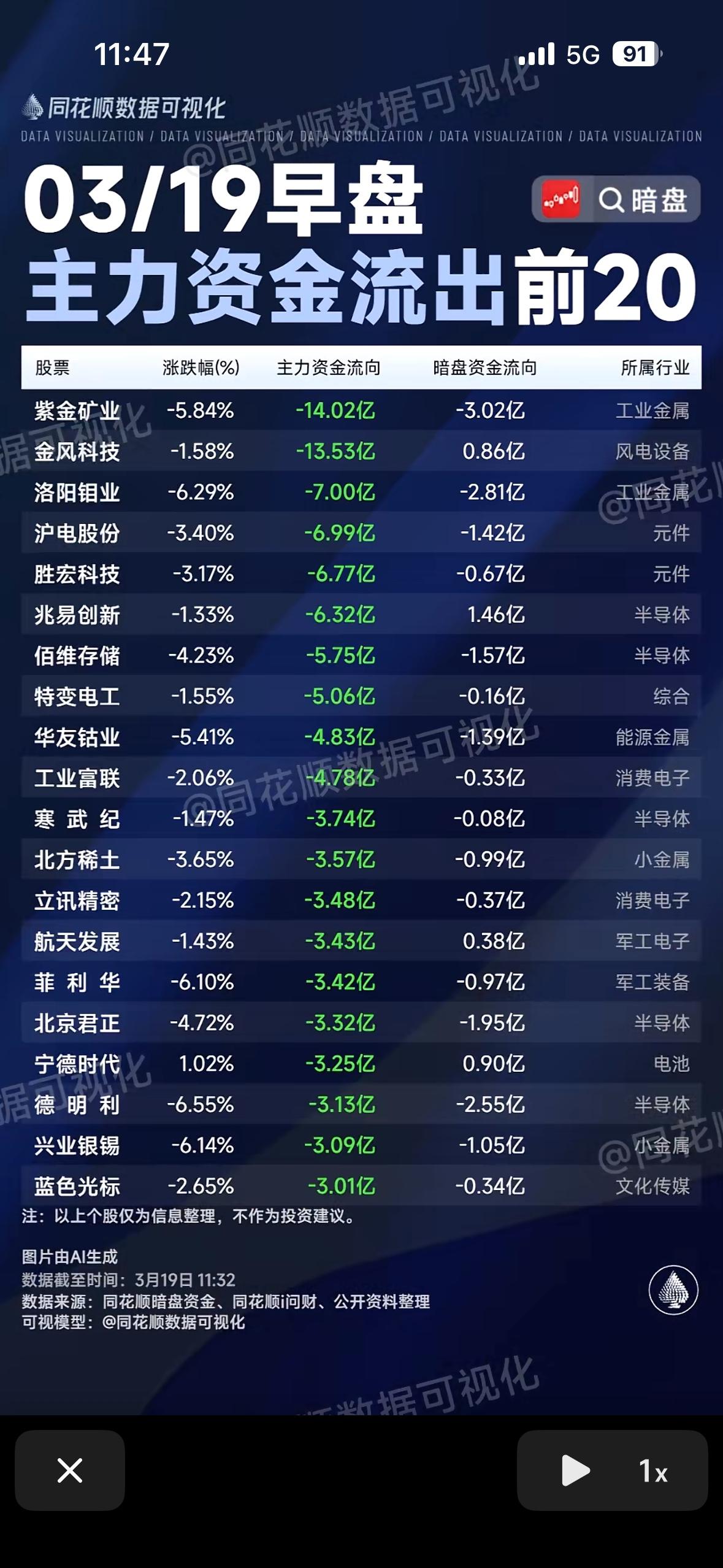 3月19日早盘主力资金净流入与净流出前20股,把握投资机会!💰📈 3月19日早盘主力资金流向很值得关注。早盘主力资金净流入通信、煤炭采选、石油石化等板块,净流出电子、有色金属、半导体等板块,电子板块净流出超121亿元。 个股方面机会与风险并存。新易盛主力资金净买入超9.44亿元居首,华工科技、金开新能等也获主力资金净流入。不过,紫金矿业遭净卖出超13亿元,开盘40分钟就净流出9.26亿。兆易创新、沪电股份、洛阳钼业等资金净流出额也居前。投资时得好好研究这些资金流向,把握机会,避开风险。