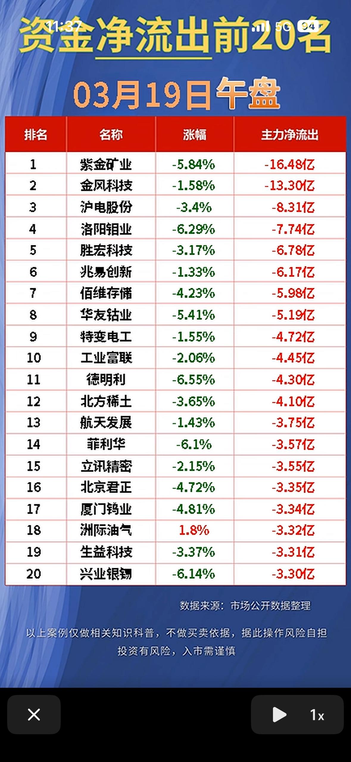 3月19日资金净流入与净流出前20名,助你把握投资机会!📈💰 3月19日的资金流向可是投资的重要风向标!开盘40分钟,主力资金流出不少个股。像紫金矿业当日净流入额为 -9.26亿,最新价33.16元;金风科技净流入 -7.57亿,最新价30.79元。兆易创新、佰维存储等也在资金流出前列。 而在港股方面,2026年3月19日,南向资金年初至今净流入已突破2000亿港元,3月9日单日狂扫372亿创历史之最。港股正处“价值重估”前夜,ETF成了这场资本战役的犀利武器。关注资金净流入与净流出前20名,说不定能抓住投资机会,实现财富增值!