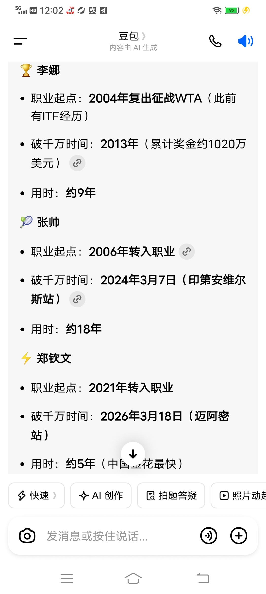 李娜、张帅、郑钦文职业生涯总奖金突破1千万美元分别用了多长时间? 李娜:从2004年到2013年,累计奖金1020万美元。 张帅:从2006年到2024年,用了18年时间。 郑钦文:凭借印第安维尔斯站上收获到奖金,郑钦文职业生涯总奖金数量已经来到了100002570美元。成为中国网坛第三位总奖金达到1000万美元的球员。她达到这一成就用了5年时间。 鉴于WTA赛事奖金的连年攀高,实际上,李娜和郑钦文在收割奖金的能力上应该是不相上下的。而张帅则凭借超长的续航能力在这方面和上面两位旗鼓相当!