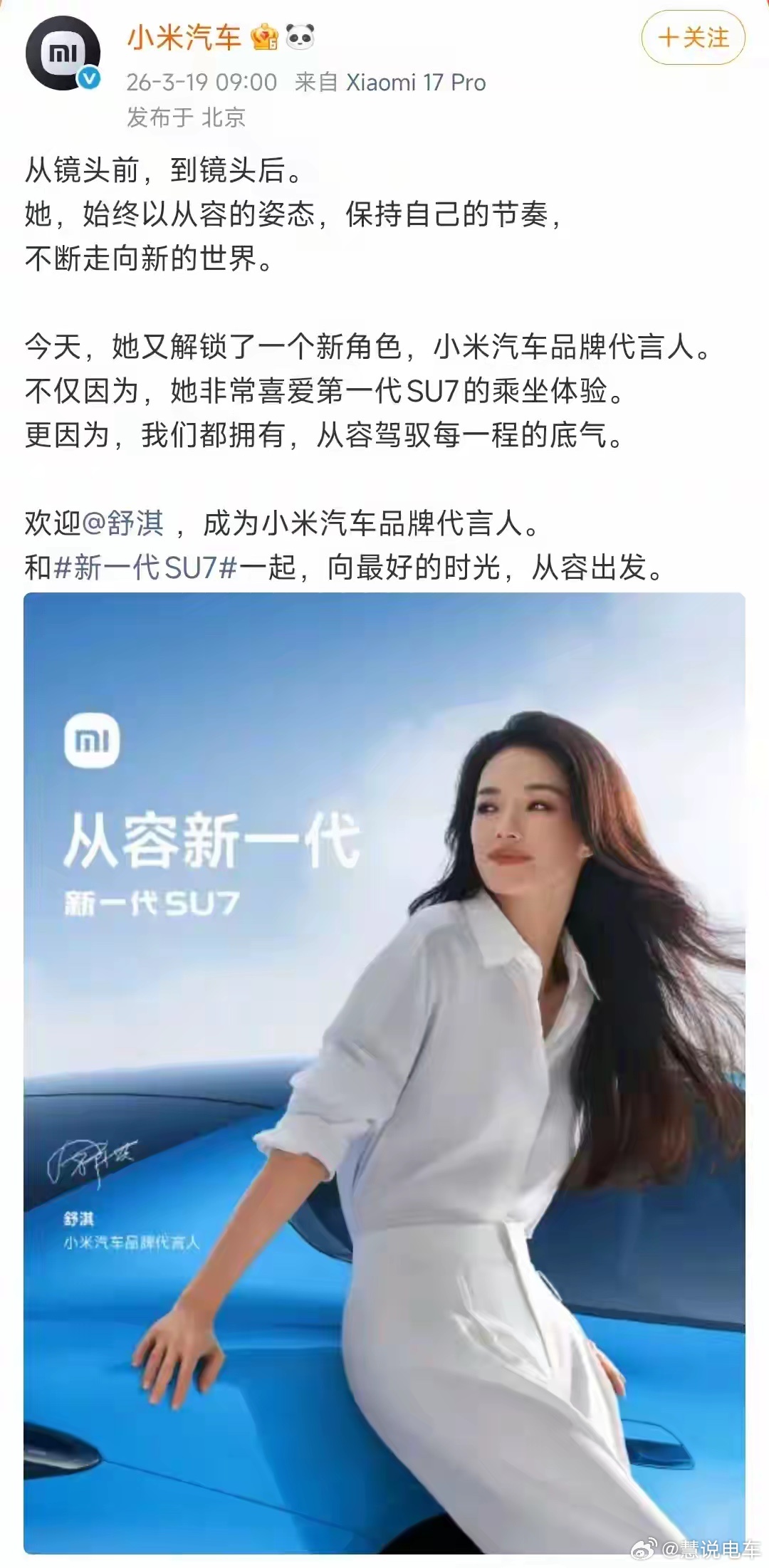 小米最近销量不佳,必须在新车型上发力了,请了代言人,全平台发力宣传新车。估计效果不错。小米小米汽车