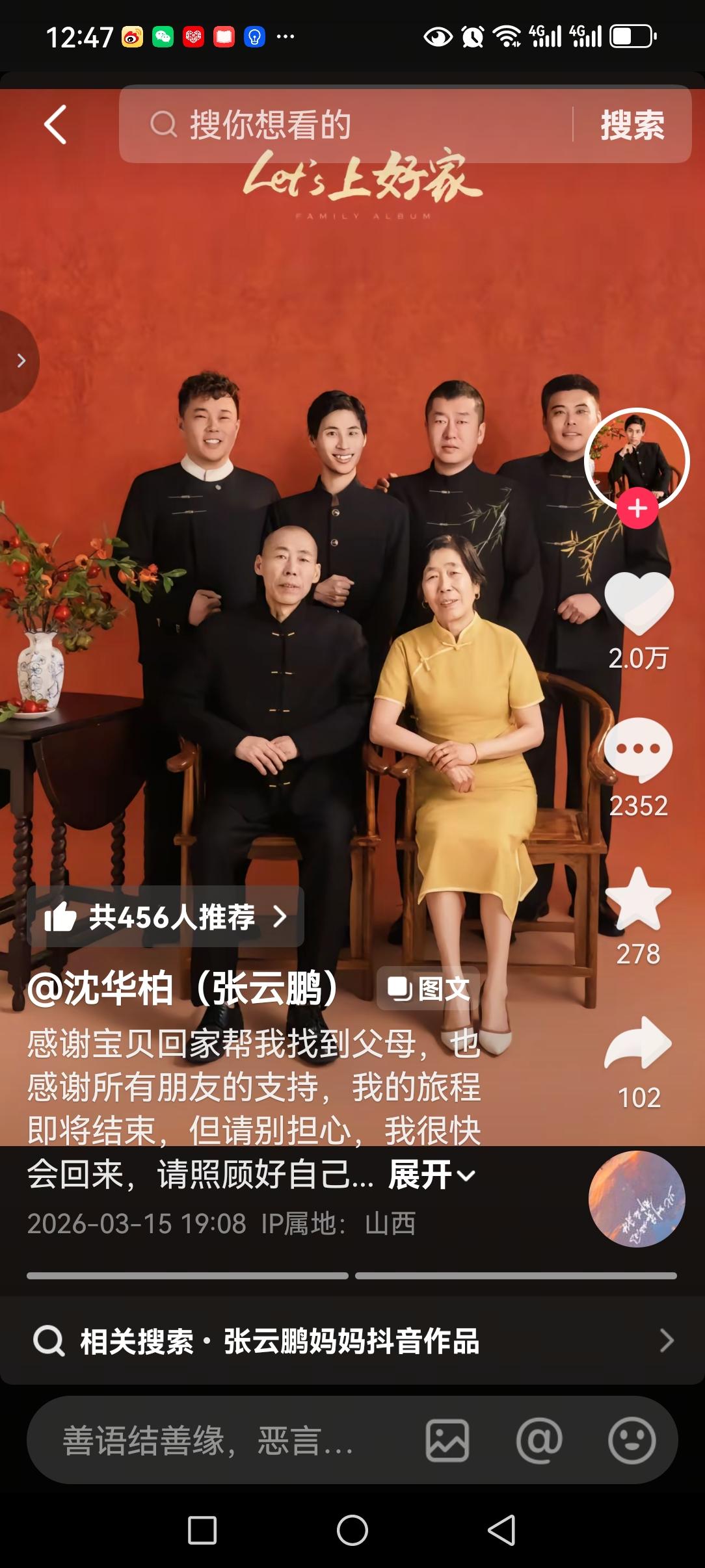 回到加拿大的云鹏接受了采访,谈了自己回国内认亲后归来的真实感受! 他说,自己现在不想呆在加拿大,就想回到中国。这次回国认亲他和亲生父母,还有兄弟姐妹相处的都非常开心。 虽然在加拿大生活了二十多年,但他在这边无亲无故,一直都是孤身一人,完全感受不到家庭的氛围。再加上他所生活的地方,并不好找工作。因为当地人大部分都说法语 ,而他只会英语,所以让他的工作也陷入了困境。 所以现在他虽然人在加拿大,但他依然迫切希望能回到国内,感受家庭的温暖。 有网友给云鹏的父亲算了一笔账,说他这段时间带货挣了三百多万,加上直播收礼物一共挣了五百万了。 如果这个网友说的是真的 ,那么云鹏的父亲现在给云鹏买房子,就是轻而易举的事情了! 只是不知道云鹏的爸爸会不会真的拿钱出来,给儿子买房子?让儿子回到国内安心生活。 大家觉得云鹏爸爸会给他买房子吗?