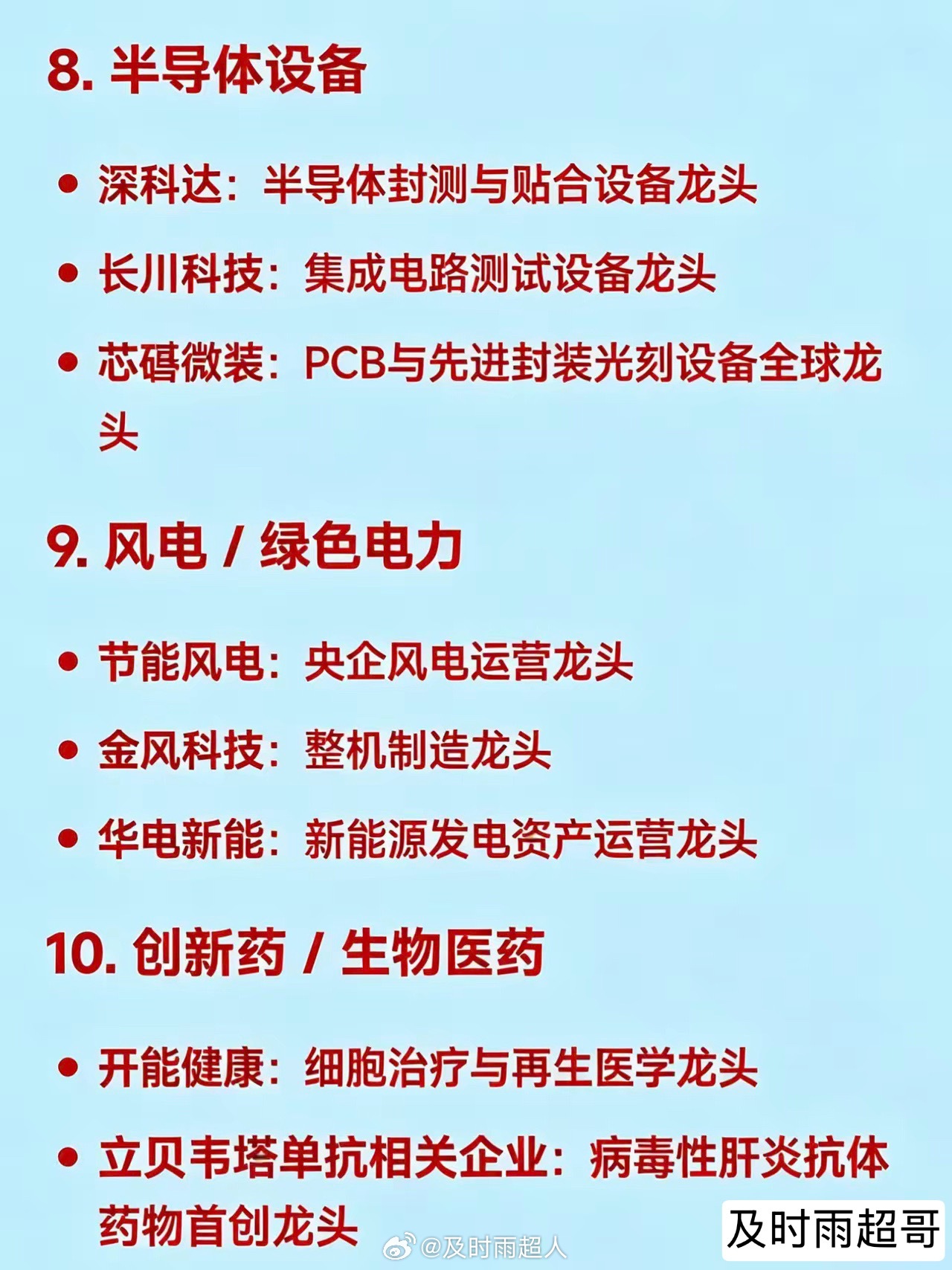 2026年3月18日十大热点科技及其产业链核心龙头1. 存储芯片佰维存储:国产存储芯片龙头中电港:电子元器件分销龙头,覆盖存储芯片全链条德明利:主控芯片+存储模组一体化龙头2. 算力租赁 / 算力基建数据港:IDC与算力基础设施龙头华胜天成:国产算力服务与系统集成龙头铜牛信息:京津冀区域算力服务龙头3. CPO(共封装光学)天孚通信:光器件与CPO组件龙头新易盛:高速光模块出口龙头瑞斯康达:接入网与光通信设备龙头4. 钙钛矿电池 / HJT电池(光伏新技术)协鑫集成:钙钛矿叠层电池量产龙头国晟科技:HJT+钙钛矿双技术路线龙头5. 智能电网 / 抽水蓄能(算电协同)顺钠股份:智能电网设备配套龙头华电辽能:绿色电力+抽水蓄能项目龙头南网数字:南方电网数字化服务龙头6. 化工(化肥、甲醇、磷化工等)金正大:复合肥龙头企业赤天化:尿素与甲醇双主业龙头六国化工:磷化工细分龙头7. 商业航天广联航空:航空航天结构件制造龙头西测测试:商业航天检测服务龙头再升科技:航天材料与过滤系统龙头8. 半导体设备深科达:半导体封测与贴合设备龙头长川科技:集成电路测试设备龙头芯碁微装:PCB与先进封装光刻设备全球龙头9. 风电 / 绿色电力节能风电:央企风电运营龙头金风科技:整机制造龙头华电新能:新能源发电资产运营龙头10. 创新药 / 生物医药开能健康:细胞治疗与再生医学龙头立贝韦塔单抗相关企业:病毒性肝炎抗体药物首创龙头免责声明:发文涉及资讯图等内容来自网络公共信息。仅供参考,不构成投资建议。