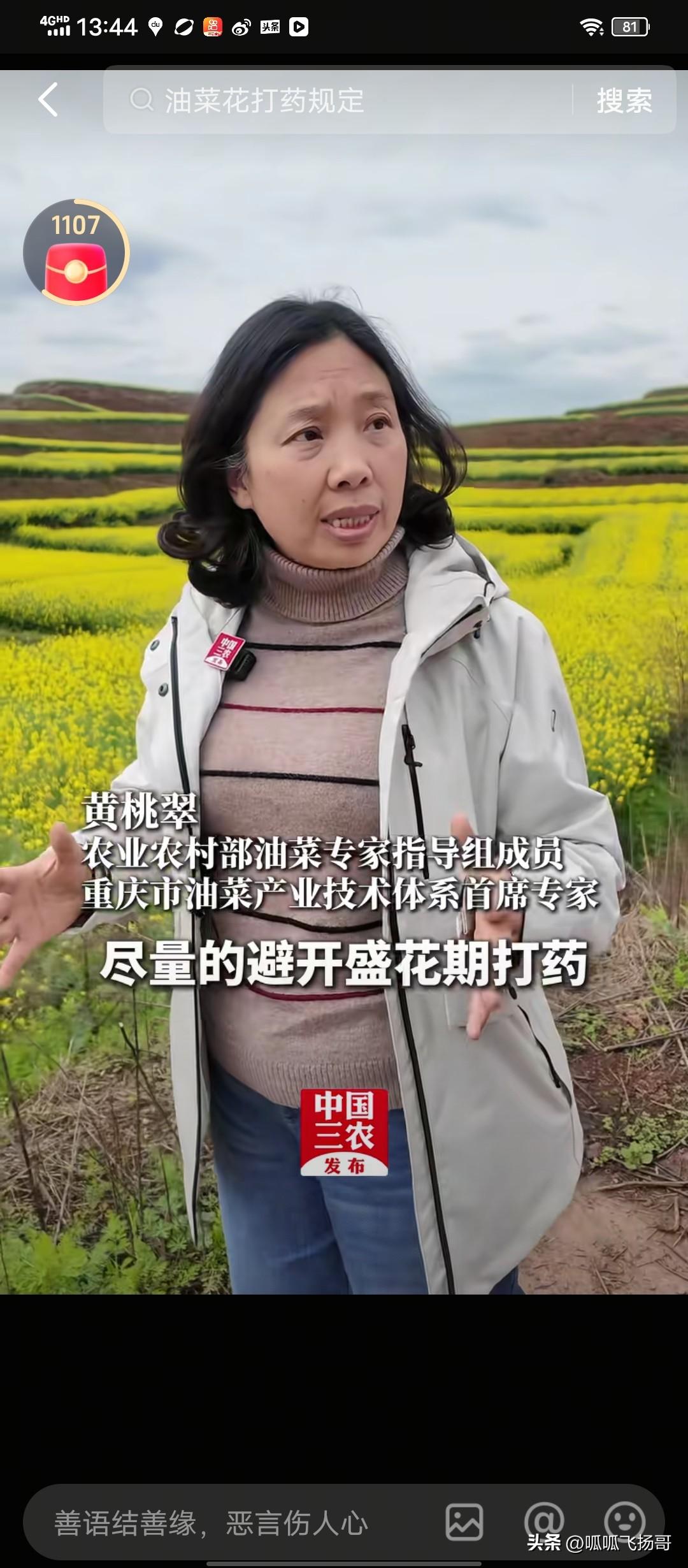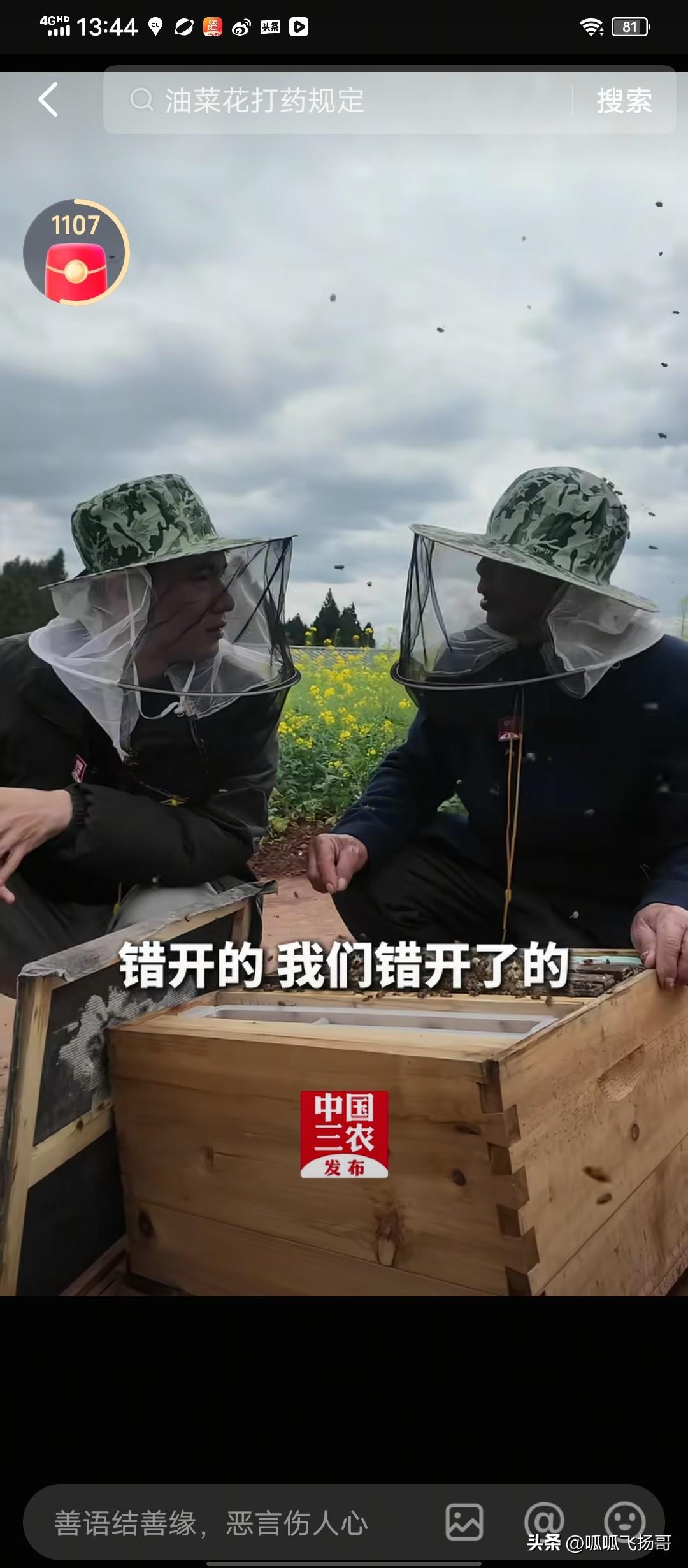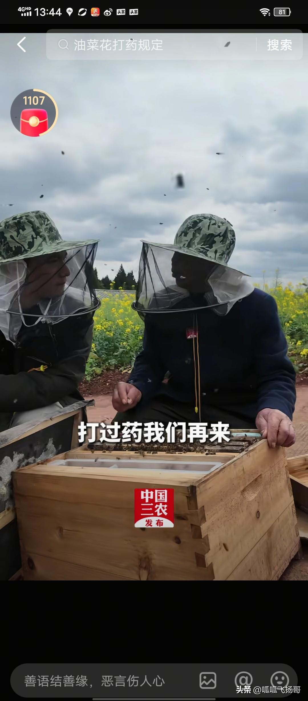给油菜花打药, 究竟应不应该? 中国三农发布记者亲赴油菜种植大镇重庆潼南区龙形镇实地对油菜种植大户和蜂农以及当地的农业专家进行面对面采访寻找答案 。 记者在一片片油菜花田的旁边看到了一个个排列整齐的蜂桶, 通过记者的镜头可以看到成千上万只蜜蜂 正在辛勤忙碌的采蜜 。 油菜花开的时候会不会打药?打药会不会毒害蜜蜂 ? 面对记者的询问,种了400亩油菜的种植大户陈祥军这样告诉记者:“今年给油菜打了三次药 , 油菜还是菜苗的时候打了一次 , 差不多在油菜开盘的时候打了一次 , 初花期的时候打了一次” 。 也就是说油菜开花的时候就不会打药了。 打药跟蜂农放蜂有没有冲突呢? 有11年养殖蜜蜂经历的蜂农杨英全告诉记者 :“比如油菜如果是在月初打药,我们在月底过来放蜂, 一般初花打药过后十来天放蜂的就过来了。 这样基本上对蜜蜂都没有什么影响了”。 蜂农也告诉记者,他们在过来放蜂以前,首先就跟当地的油菜种植农户先联系,了解给油菜花打药是在什么时候。 打药过后一个星期或者10多天过来,对蜜蜂一点都没有影响了 。 看来蜂农跟油菜种植农户的紧密联系沟通也非常重要 。 重庆市油菜产业技术体系首席专家王陶翠在油菜花地头告诉记者 , 她们的指导方针是尽量避开盛花期打药 ,打药尽量放在初花期, 初花期就把该施的肥施了,该打的药打了 , 把菌核病在初花期的时候把它防好了,盛花期的时候就没有了 ,在盛花期的时候就不用打药了 。 盛花期的时候,蚜虫是比较少的,蚜虫主要集中在收获前的青荚角期到成熟期。 那时候农户就要把防虫放在终花期接近青荚角期的时候 。 总结起来就是打药在开花前和花谢后,在油菜结青荚的时候打农药,这样就跟蜜蜂采蜜和授粉完全错开了。 看来给油菜花打药,这才是正确的做法 。
