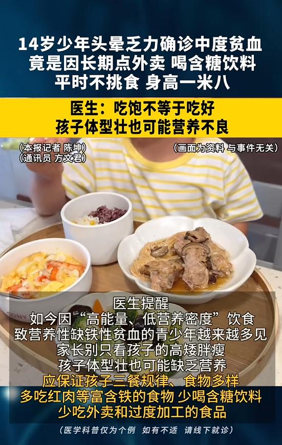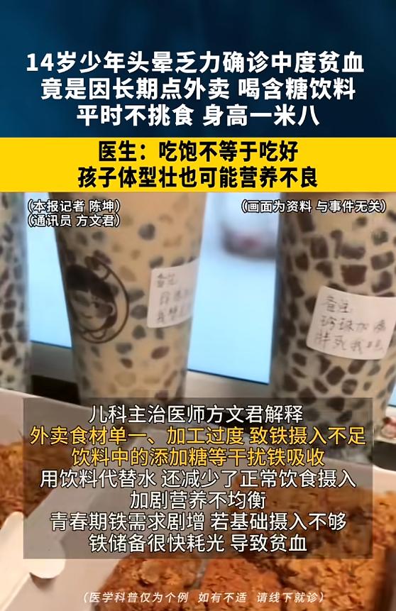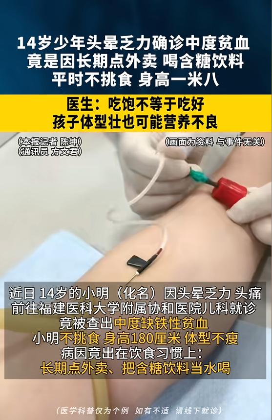“悲剧还是发生了!”福建,一14岁男孩身高1米8 ,体型壮实,从不挑食,可最近一个月持续头晕乏力,脸色苍白,后面还出现头痛,去医院检查,竟被查出中度缺铁性贫血,原来,这都是男孩长期点外卖并且把饮料当水喝造成的!网友:万万没想到! 福建一名14岁男孩,身高足足有1米8,体型看着也壮实,平时吃饭也不挑食,谁看了都觉得这孩子身体倍儿棒,可谁能想到,一场突如其来的不适,打破了这份看似健康的状态。 就在最近一个月,这孩子总说自己头晕乏力,不管是上课还是休息,都提不起精神,脸色也变得白白的,没有一点少年人的血气,一开始家里人没太在意,觉得可能是孩子学习太累,休息不好导致的,想着让他多睡几天就好了。 可没想到,情况并没有好转,反而越来越严重,后来孩子还开始频繁头痛,有时候疼得连书都看不了,甚至影响到了正常上课和生活。 家里人这才慌了神,赶紧带着孩子去医院做检查,这一查,结果让所有人都惊呆了,孩子被确诊为中度缺铁性贫血。 医生拿着检查报告说,孩子的血红蛋白浓度只有64g/L,而14岁男孩正常的血红蛋白参考值大概在120-160g/L,已经明显低于正常标准,属于中度贫血,再拖下去,可能会影响生长发育,甚至引发更严重的问题。 家里人满是疑惑,孩子明明长得壮实,也不挑食,怎么会缺铁贫血呢?医生仔细询问了孩子的生活习惯,真相才算浮出水面,说白了,这都是孩子长期的不良饮食习惯惹的祸。 原来,这孩子平时在家吃饭的次数很少,大多时候都是点外卖解决,而且特别爱喝含糖饮料,几乎把饮料当成了白开水,一天到晚都离不开,医生解释,长期这样的饮食模式,就是导致他贫血的关键原因。 很多外卖为了口感和控制成本,食材种类都比较单一,还经过过度加工,真正富含优质铁的瘦肉,动物肝脏之类的食材很少,长期吃下来,铁的摄入根本不够。 再加上饮料里的添加糖,磷酸盐等成分,会干扰身体对铁的吸收,而且喝多了饮料,还会减少正常饭菜的摄入量,营养就更不均衡了。 更关键的是,14岁正是青春期,是孩子身高体重快速增长的阶段,身体对铁的需求达到了高峰,这时候铁摄入不足,再加上吸收被干扰,体内的铁储备很快就被耗尽,贫血自然就找上门来了。 确诊后,医生给孩子制定了治疗方案,除了按时服用铁剂纠正贫血,最关键的就是调整饮食习惯,戒掉饮料,少吃外卖,多吃富含铁的食物,定期复查。 目前,孩子的贫血情况已经有了好转,但还需要长期坚持健康的饮食,才能彻底恢复,这件事被分享出来后,网友们都直呼万万没想到,谁能想到一个1米8的壮实男孩,会因为吃外卖喝饮料患上贫血。 其实这也给很多家长提了个醒,别只盯着孩子的身高和体型,觉得孩子长得壮就没事,吃饱不等于吃好,不良的饮食习惯,正在悄悄伤害孩子的身体,尤其是青春期的孩子,一定要养成健康的饮食和饮水习惯,才能好好长大。