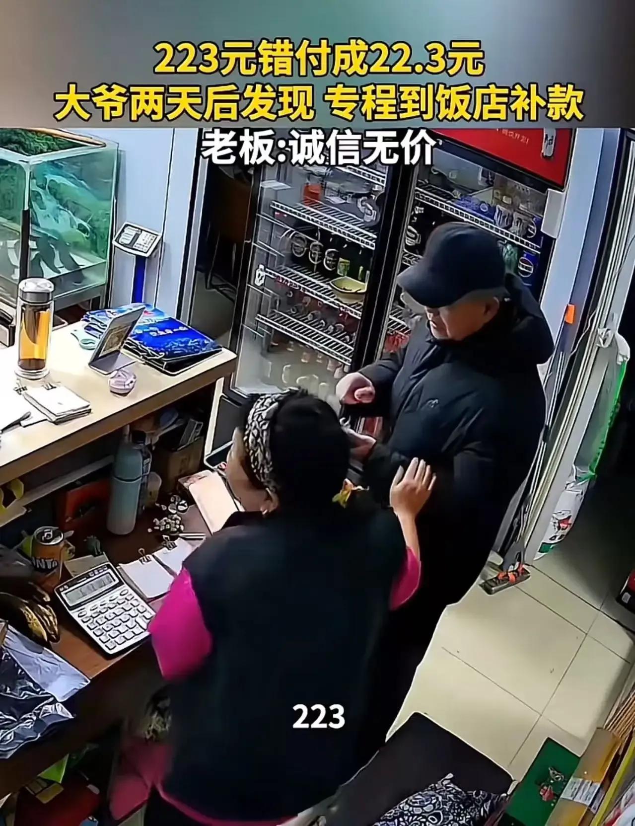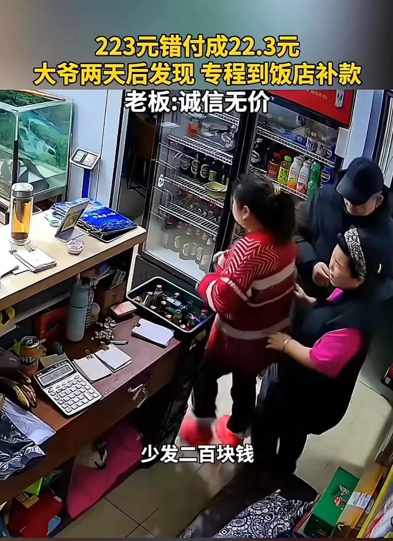 “这才是老人该有的样子!”近日,一位大爷在饭店的举动让网友们纷纷点赞,究竟发生了什么事呢?让我们一起来看看。 这位大爷来到饭店,跟老板说自己付错钱了。老板一听,下意识地以为大爷是付多了,于是问大爷多给了多少钱。没想到大爷却说:“是我给少了!我把223元错付成了22.3元!”老板听后一脸吃惊,毕竟钱给少了还特地送过来,这种情况并不多见。大爷见状,乐呵呵地解释道:“你们开店做生意,起早贪黑,多不容易啊!我要是揣着这便宜回家,晚上睡觉能踏实吗?心里头堵得慌!”原来,大爷是担心自己占便宜会让老板吃亏,更怕自己因此心里不安,所以特地回来补上差价。这番话让老板感动不已,也让网友们纷纷为大爷点赞。在这个物欲横流的社会,大爷的举动无疑是一股清流,让我们看到了人性的善良和诚信。 大爷的举动让我们感受到了温暖和正能量,也让我们更加坚信,诚信和善良是永远不会过时的美德。快来评论区分享你的看法吧,让我们一起为大爷的诚信行为点赞!大爷反应亮了 大爷感悟 大爷勇敢行为
