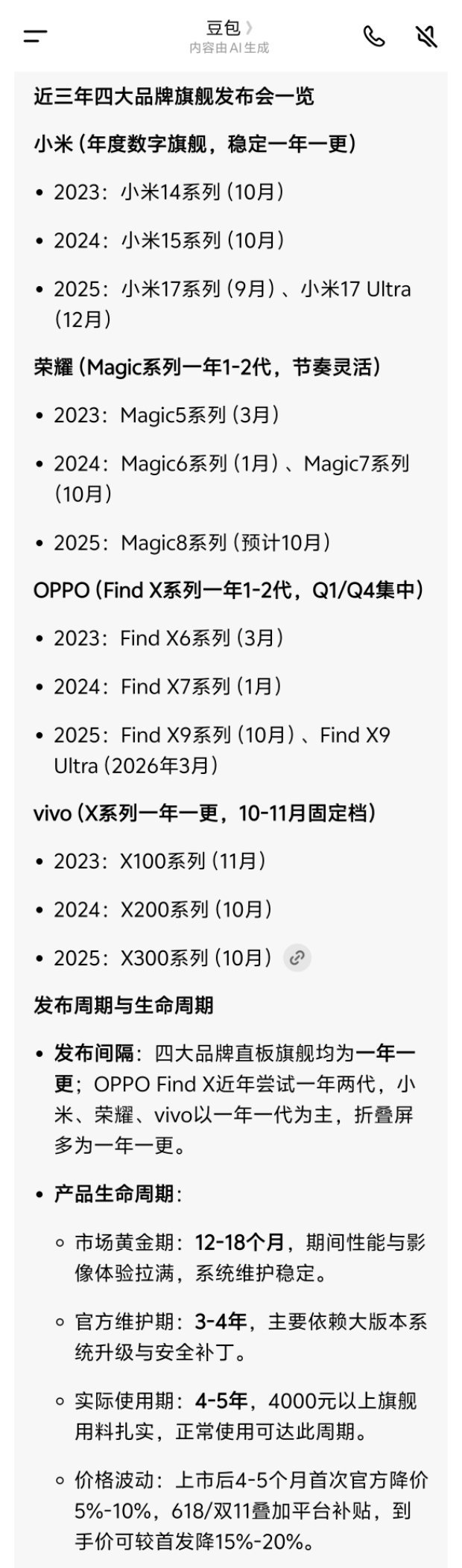 旗舰机该延长产品周期吗各家手机品牌基本上以前还都是维持旗舰机型一年一更新的,到现在一年两次迭代已经很普遍了。每年10–11月左右,高通骁龙峰会和联发科芯片新品都会发布,比如骁龙8 Gen1,联发科天玑9300,次年4-5月,再发布一个更高频的升级版芯片,比如骁龙8+ Gen1,联发科天玑9300+所以就变成我们今天看到的,旗舰手机迭代周期缩短,半年就成老款了。产品快速迭代的背后原因也很简单,手机品牌需要保持新鲜感和话题度来维持吸引力,但也造成一个问题,消费者们发现厂家的新机预热时间越来越长,预热很久不见发布;发布不久又要出新机了,这样一个循环中。机海战术是目前国内内卷严重的一个体现,当然也催生了大家都铆足了劲,不断创新和突破自我的动力,有好也有坏。