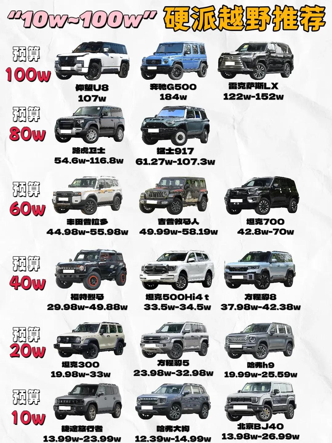 10万–100万全价位硬派越野选购指南|新手不踩坑,直接闭眼入✨ 想玩硬派越野又不知道怎么选?这篇从入门到旗舰全覆盖,城市代步、周末穿越、长途越野都能满足,优缺点直白讲透,照着买不迷路。 10W级 · 入门玩票选 代表车型:捷途旅行者、哈弗大狗、北京BJ40 - 亮点:价格亲民,带四驱+非承载车身,越野底子够硬,颜值高、改装空间大。 - 不足:舒适性一般,油耗偏高,城市开噪音偏大,配置偏基础。 - 适合:预算有限、喜欢越野风格、轻度穿越+日常代步的年轻人。 20W级 · 家用越野两不误 代表车型:坦克300、方程豹5、哈弗H9 - 亮点:坦克300颜值高、城市通勤也合适;方程豹5插混省油、可上绿牌;H9空间大、长途舒服。 - 不足:坦克300油耗不低;方程豹5车机略复杂;H9内饰偏成熟。 - 适合:既要家用舒适,又想偶尔越野的年轻家庭。 40W级 · 进阶玩家实力派 代表车型:福特烈马、坦克500Hi4-T、方程豹8 - 亮点:烈马操控灵活、越野能力强;坦克500豪华舒适,商务家用都能撑场面;方程豹8科技与续航双在线。 - 不足:烈马进口保养贵;坦克500车重起步偏柔。 - 适合:经常越野、追求品质与通过性的进阶玩家。 60W级 · 经典情怀硬通货 代表车型:丰田普拉多、Jeep牧马人、坦克700 - 亮点:普拉多耐用保值、几乎开不坏;牧马人改装无上限,越野圈信仰级;坦克700机甲外观、性能强劲。 - 不足:普拉多配置简单;牧马人城市代步累;坦克700油耗偏高。 - 适合:越野老炮、情怀玩家、看重可靠性与保值率的人。 80W级 · 豪华越野天花板 代表车型:路虎卫士、猛士917 - 亮点:卫士气场强、豪华与越野兼顾;猛士917国产硬核旗舰,科技拉满、通过性拉满。 - 不足:价格高、油耗高、养车成本不低;猛士917车身偏大,停车不太方便。 - 适合:预算充足、追求排面与极致性能的高端玩家。 100W级 · 顶级旗舰象征 代表车型:仰望U8、奔驰G500、雷克萨斯LX - 亮点:仰望U8原地掉头、浮水模式黑科技拉满;奔驰G级气场无敌,身份象征;LX舒适可靠两不误。 - 不足:价格昂贵、油耗极高,城市实用性一般。 - 适合:追求顶级体验、收藏级玩家、商务与越野双需求的用户。 购车核心建议 1. 按预算直接锁区间:10W入门、20W家用兼顾、40W进阶、60W+情怀与豪华。 2. 按需求选: - 纯玩越野:牧马人、福特烈马更强更耐造。 - 家用+越野:坦克300、方程豹5、H9最均衡。 - 情怀排面:普拉多、卫士、奔驰G级闭眼冲。 3. 试驾必试:四驱响应、通过性、底盘舒适度,硬派车既要能野,也要能日常开。 越野没有最好,只有最适合。按预算和用途选,你的越野人生从此开始!【来自懂车帝车友圈】