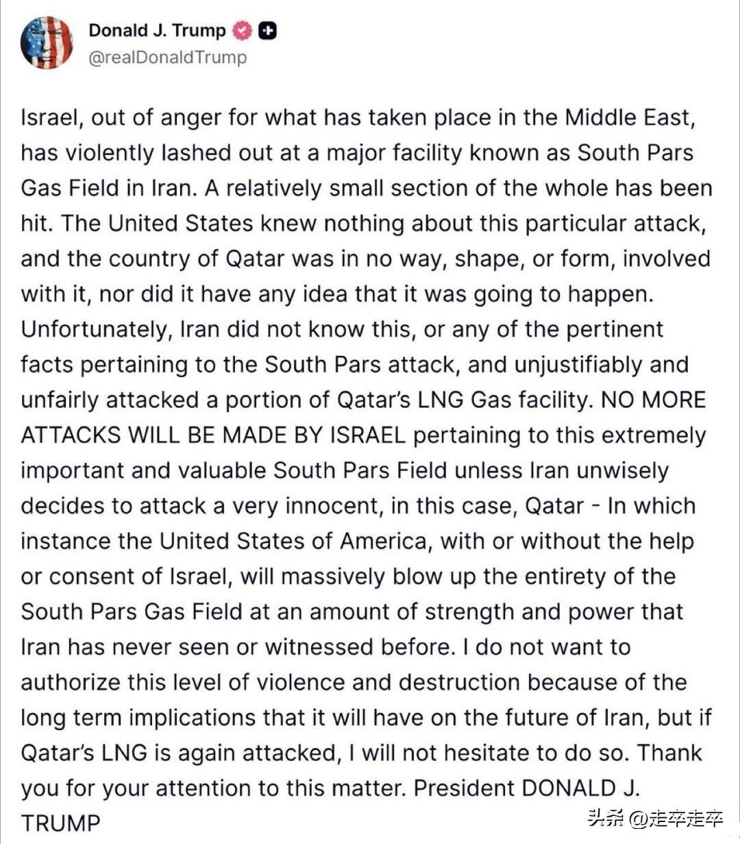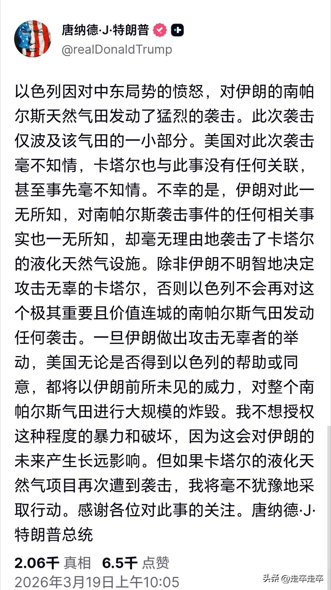 伊朗掀桌子轰炸卡特尔、沙特炼油厂。特朗普着急了? 伊朗于3月19日凌晨发起“真实承诺-4”第63轮军事行动,使用导弹精准打击沙特利雅得炼油厂的美方专属区域(为美军苏丹王子空军基地供油)及卡塔尔拉斯拉凡工业城(全球最大液化天然气枢纽)。袭击导致大规模火灾,直接瘫痪美军战机燃料补给链。 特朗普指责伊朗在不知晓袭击事实的情况下,无缘无故攻击卡塔尔液化天然气设施,并警告若再犯将面临前所未见的毁灭性打击。特朗普声称 ,此前以色列对伊朗南帕尔斯天然气田发动猛烈袭击,美方事先不知情。但以色列官员向美媒透露行动“获美方支持”,这就说明了美以对伊朗战争策略的矛盾。 目前伊朗把话说得很清楚,所有美国股份的能源设施,现在跟美军基地一个待遇,成为合法打击目标。凭什么?因为前一天伊朗南帕尔斯油气设施被以色列给炸了,全国40%天然气断供。这叫“对等报复”,你炸我多少,我就炸你多少。 看来战争状态升级了,之前只针对军事目标,现在直接打击整个中东地区能源命门。你们美以打击我经济动脉,我就炸你盟友的经济命门,看谁先扛不住油价。伊朗将目标从军事基地转向能源设施,意味着冲突进入“能源绞杀战”阶段。通过打击美军后勤命脉(沙特炼油厂)及全球能源枢纽(卡塔尔液化天然气基地),迫使美以承受经济代价。此举同时向海湾国家施压,警告其勿为美军提供支持。海湾国家陷入了一个死循环。本来让美军驻扎是为了安全,但美军驻扎了反而招来更多导弹。这些国家成了美以与伊朗战争的“肉票”。 现在最关心的问题沙特会不会报复,短期可能性不大。沙特的经济高度依赖石油出口与地区稳定,一旦卷入军事冲突,本国能源设施、经济发展和国际投资环境都会遭受重创。其次沙特此前已与伊朗达成相关共识,不允许美国利用本国领土攻击伊朗,伊朗本次的袭击也精准避开了沙特主权目标,给沙特留下了足够的面子。沙特出于自身安全和经济考量,会不会保持克制态度不参加这次战争?我们拭目以待!