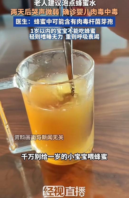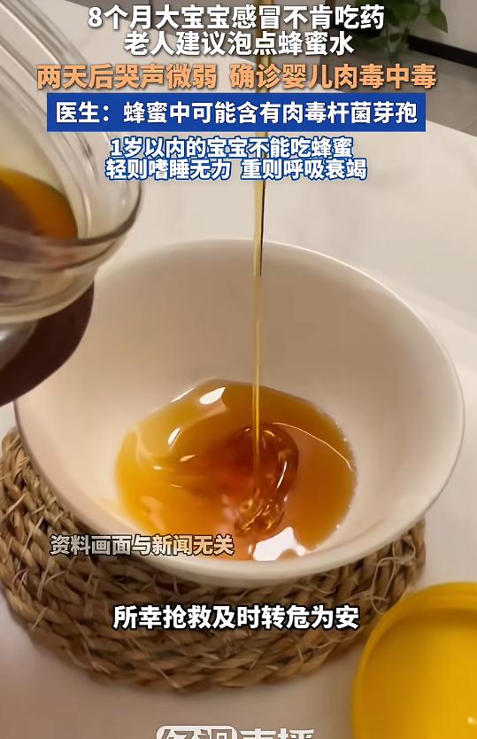 “千万别给一岁以内的小宝宝喂蜂蜜!”近日,河北石家庄,一宝宝感冒咳嗽不肯吃药,老人建议泡点蜂蜜水喝,没想到两天后,宝宝突然嗜睡,吃奶困难,并且哭声微弱,送医后确诊为婴儿肉毒中毒,而罪魁祸首,就是那杯蜂蜜水!网友:宝宝不能喝蜂蜜? 家里有小宝宝的家长,大概率都体会过那种手足无措的煎熬。 宝宝感冒咳嗽,每咳一声都带着浓浓的鼻音。 而每到喂药的时候,宝宝都像是察觉到了什么,拼尽全身力气抗拒,手脚拼命蹬踹,脑袋一个劲往后躲。 哭声撕心裂肺,到最后嗓子都哭得沙哑发疼,连微弱的哼唧声都带着哽咽。 一旁的大人急得手心冒汗,看着孩子难受的模样,心疼得直掉眼泪,可偏偏一点办法都没有,既不敢硬灌药伤了宝宝,又看着宝宝的咳嗽束手无策。 这个家庭的小宝宝才几个月大,由于温差较大,不小心受凉感冒了。 感冒让小宝宝有时候咳得睡不着觉,精神也越来越差,连平时最喜欢的小玩具都提不起兴趣。 最让家长头疼的是喂药,不管是哄着还是抱着,宝宝只要看到药勺就哭闹不止,嘴巴闭得紧紧的,一滴药都喂不进去。 那天,家里老人跟家长念叨,说自己年轻的时候,不管是大人还是小孩感冒咳嗽,泡一杯蜂蜜水喝。 家长其实也有点拿不准主意,但看着宝宝咳得难受,再加上想着蜂蜜总比药物温和,就抱着试试看的心态,泡了一杯淡淡的蜂蜜水,用小勺子一点点喂给宝宝。 没想到,宝宝还真不抗拒,几口就把蜂蜜水喝光了。 看到这一幕,家长和老人都松了口气,以为这下总算能帮宝宝缓解不适,不用再为喂药发愁了。 喝了蜂蜜水的第一天,宝宝看起来没什么异常,咳嗽似乎也轻了一点,精神状态也比之前好了些。 可到了第二天下午,宝宝突然变得异常安静,不像平时那样爱动爱闹,反而总是昏昏欲睡。 不管家长怎么叫、怎么逗,都很难叫醒,嗜睡的症状越来越明显。 而且宝宝饿了想吃奶,嘴巴却怎么也张不大,吸吮的力气特别小。 平时几分钟就能喝完的奶,那天喝了一小口就再也喝不进去了。 更反常的是,宝宝的哭声变得特别微弱,以前哭闹起来声音洪亮,能传遍整个屋子,可那天却只是微弱地哼哼,几乎听不到洪亮的哭声。 家长再也不敢耽搁,赶紧抱着宝宝往附近的医院狂奔。 经过几个小时的详细检查和会诊,医生最终给出了确诊结果——婴儿肉毒中毒。 而让宝宝陷入危险的真正源头,正是蜂蜜水。 万幸的是,小宝宝已经逐渐康复,家长也终于放下了悬着的心。 很多家庭都存在一个普遍的认知误区:大人喝蜂蜜没事,宝宝喝也肯定没事,而且蜂蜜是天然的。 可大家不知道的是,蜂蜜里或许会含有一种名为肉毒杆菌芽孢的有害成分,这种芽孢即便用开水冲泡,也很难将其彻底清除。 它本身的毒性并不强,成年人摄入少量这种毒素,一般不会有明显的不适,因为成年人的免疫和防御系统比较强大,所以很少会出现中毒症状。 但一岁以内的婴儿就完全不同了,他们的肠道还处于发育阶段,肠道菌群还没有建立完善,抗病能力非常弱。 (信息来源:经视直播《老人给8个月宝宝喂蜂蜜水致中毒》)