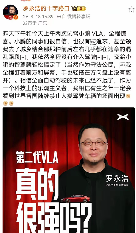 直接请罗永浩来测第二代VLA,谁都知道老罗有多挑剔、多敢喷,一般车企根本不敢请。敢把最挑刺的人请来实测,摆明了就是:我技术够硬,随便你测!这哪是试驾,分明是公开质检。不玩套路、不搞滤镜,行就是行,不行就是不行。 能这么干,只能说明小鹏对自己的技术,是真 的有底气。