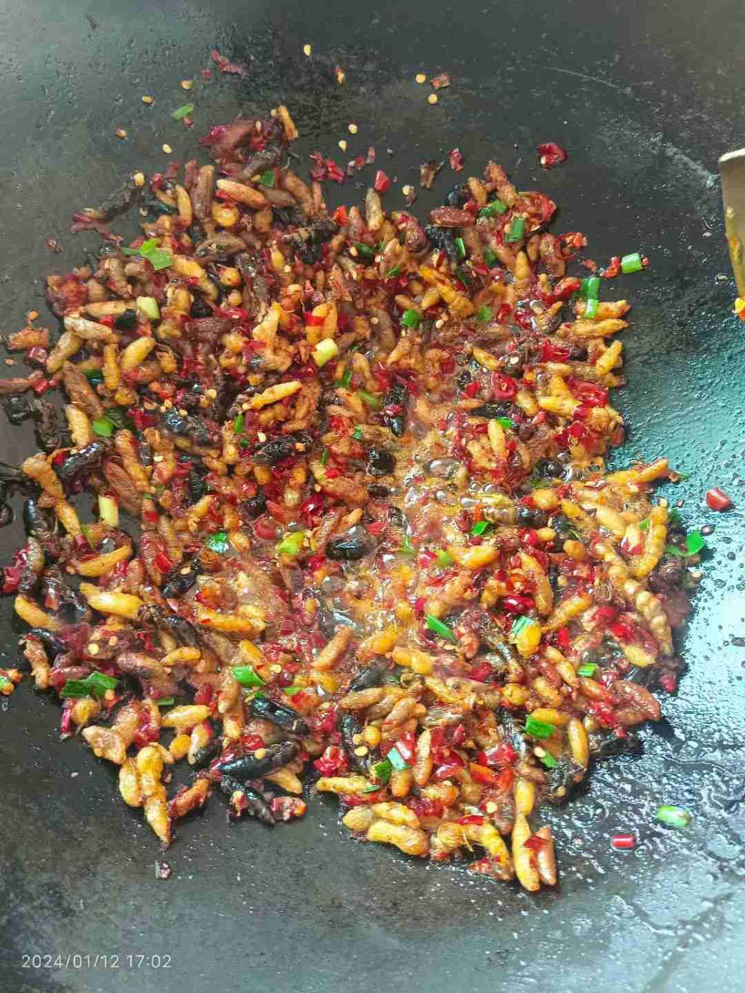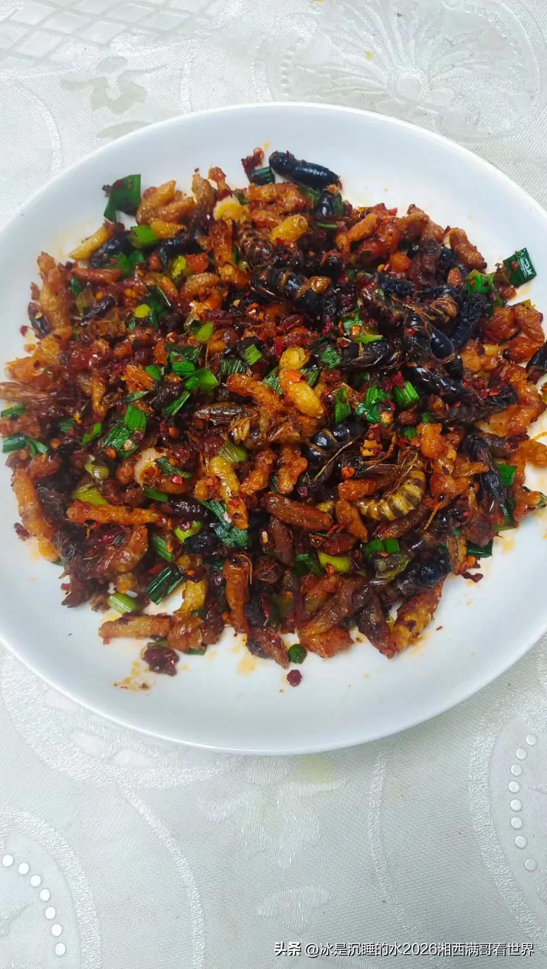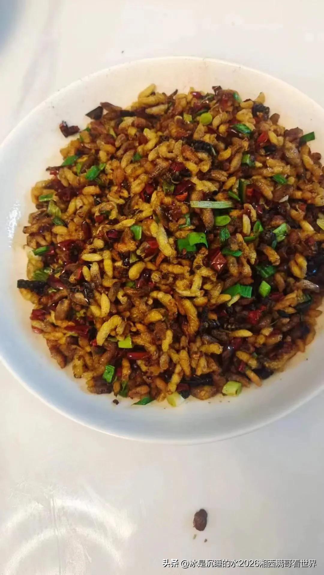 我的今日状态:😁轻松愉快 我这里的天气:🌧下雨 又到朋友家蹭饭。湘西山区特色的蜂蛹炒得真棒,色香俱全,特别下饭。