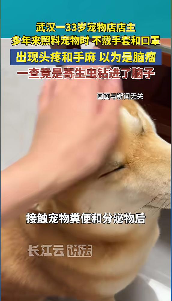 “万万没想到!”近日,湖北武汉,一位宠物店店主多年来间断性的头晕头疼,他也一直没在意,只当是累的。直到最近出现了面目麻木,甚至被怀疑是颅内肿瘤,他才重视起来。最终经过检查,竟然是脑袋里长了寄生虫。网友:干这行一定要注意防护! 从上幼儿园开始,老师就教饭前便后要洗手,就为了给孩子养成良好的卫生习惯,因为这真的很重要,能阻断不少病症。 据媒体3月17日报道,店主李先生今年33岁,自己经营了一家宠物店。平时不注意防护,卫生也不怎么注意。 每次在店里干活,喂动物,打扫粪便时,他很少戴手套跟口罩。干完活也没能及时的洗手消毒。多年来,他一直断断续续地出现头晕头疼的症状。这也没能引起他的注意,只当自己是累的。 直到最近一段时间,李先生的症状发生了变化,他开始出现了手麻面麻,这才赶紧去了医院。刚开始,李先生被怀疑是颅内肿瘤,这可把他和家人给吓坏了。 好在经过医生的详细检查,最终确认李先生是颅内寄生虫感染。原因就是他平时太不注重卫生,寄生虫从宠物传播到了他的身上。医生借助机器人,把李先生的颅内的虫子完整取了出来。 网友看后表示,宠物的身上其实并不干净,平时一定要多清洁,驱虫也要定期去做。和宠物接触的时候,不要太过亲昵,事后一定要注意洗手消毒! 信息来源:《男子头疼多年,一查竟是脑子里有寄生虫。》长江云说法
