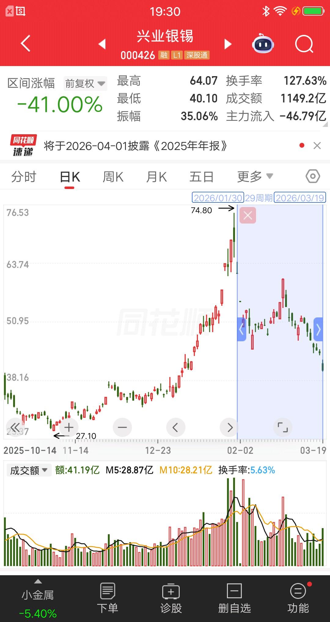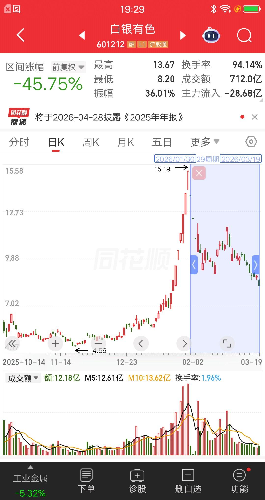 有色金属板块,跌的最惨的票诞生了,看完头皮发麻,再也不敢追高了。板块指数从高位到现在,跌了29个交易日了,跌幅达到25%。要知道这可是指数跌幅,个股更是惨不忍睹呀。 白银有色跌的最狠,股价从15元跌到8元,跌幅近47%腰斩了。兴业银锡,股价从74元跌到40元,跌幅45%。其余个股,跌幅三十个点的比比皆是,就问你们惨不惨? 这就是散户亏钱的根源,主升浪十分胆怯,赚钱的时候就像惊弓之鸟,稍微一跌就吓跑了。主跌浪被套拿着不动,还喜欢补仓。 以后再也不敢碰高位票了。