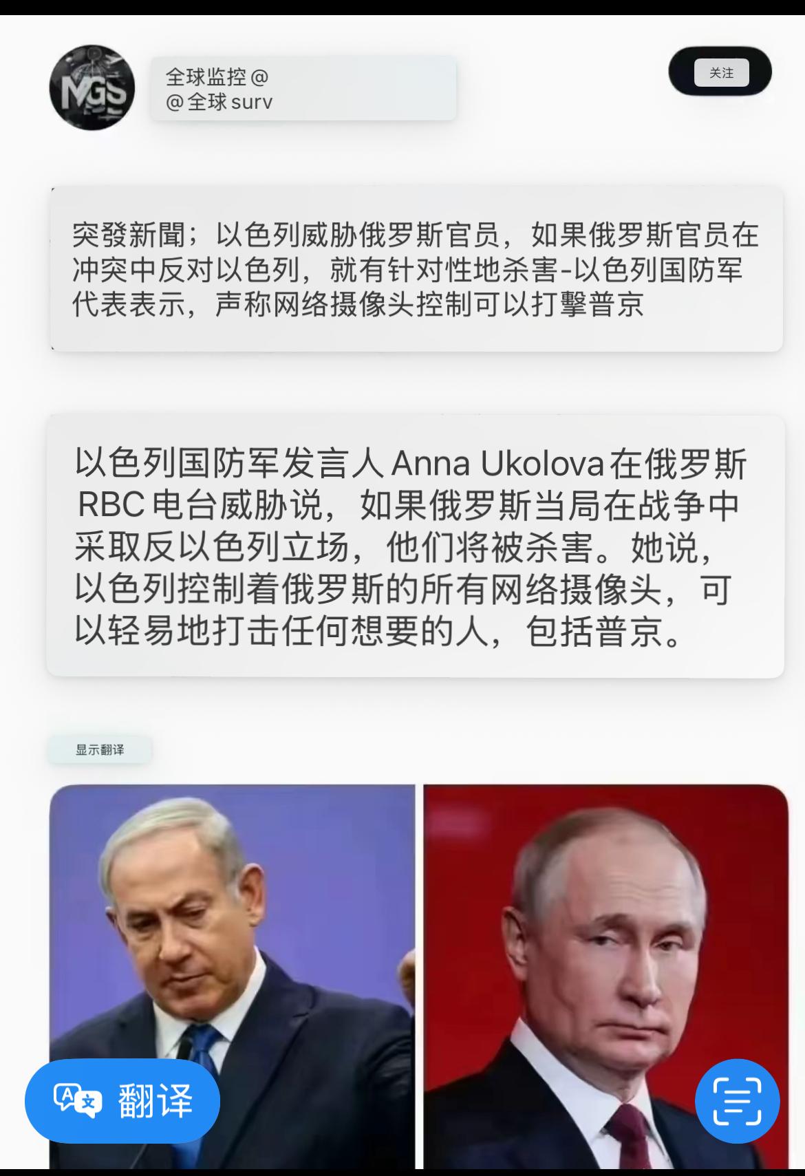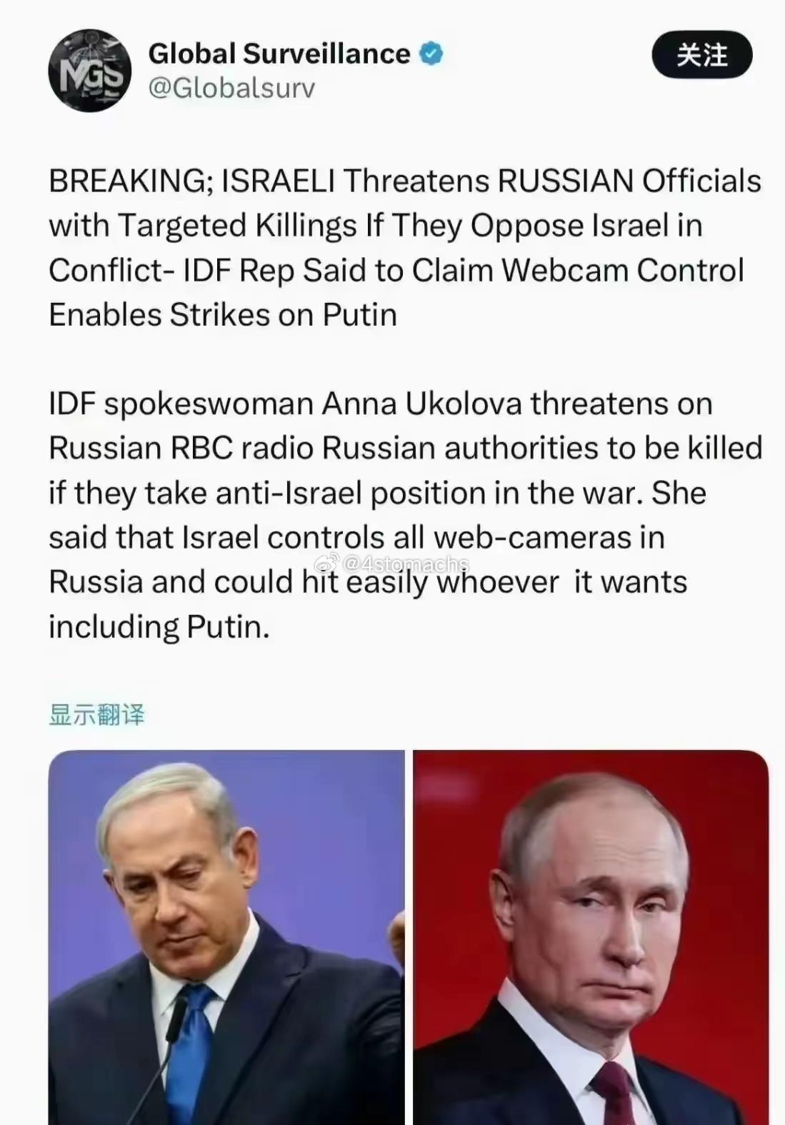 真是疯狂!以色列竟威胁俄总统普京,看来其距离毁灭之日已不远! 以色列国防军发言人安娜宣称,要是俄罗斯当局在战争中采取反以色列立场,就会被消灭。 据称,以色列国防军代表表示,通过控制网络摄像头,以色列有能力对普京发动攻击。 她还放言,以色列掌控着俄罗斯所有的网络摄像头,能轻易袭击任何它想袭击的目标,普京也在其中。 这般狂妄言论,着实令人震惊,简直是自不量力。俄罗斯拥有强大军事力量与先进国防体系,其战略核力量令世界畏惧。一旦被激怒,以色列将承受难以想象的后果。 以色列此举无疑是在挑衅俄罗斯底线,严重侵犯俄罗斯主权与尊严。 可以说,以色列这番威胁言论,无异于自寻死路。