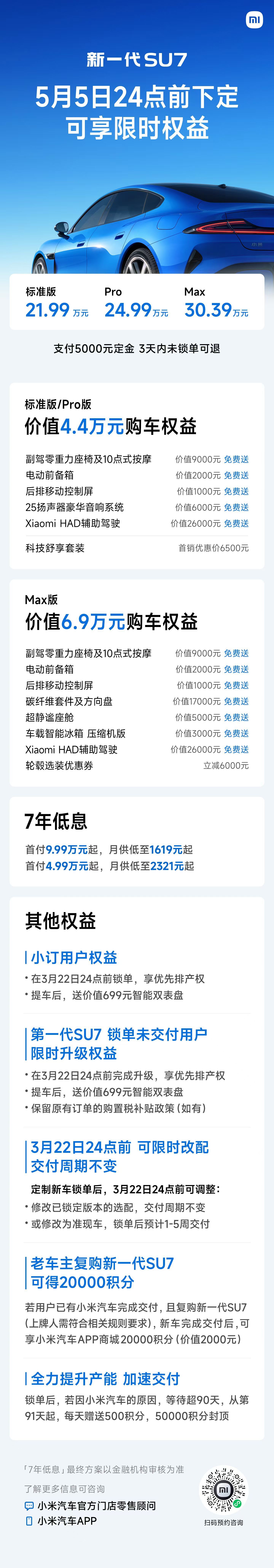 【全新一代小米SU7配置一图看懂】今晚小米SU7交定金的海报估计又要爆了估计1小时20万辆?提醒一下:5000块不锁单3天内可以退,凑热闹的朋友不要点锁单哈😄去年就有凑热闹误点了锁单又嚷嚷退的🤣