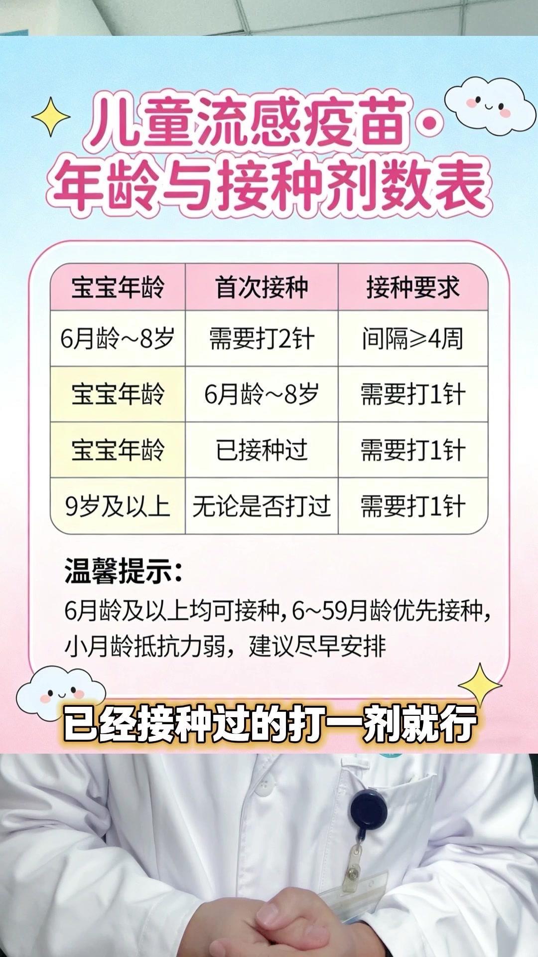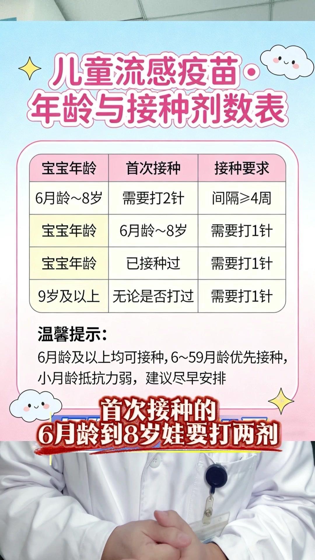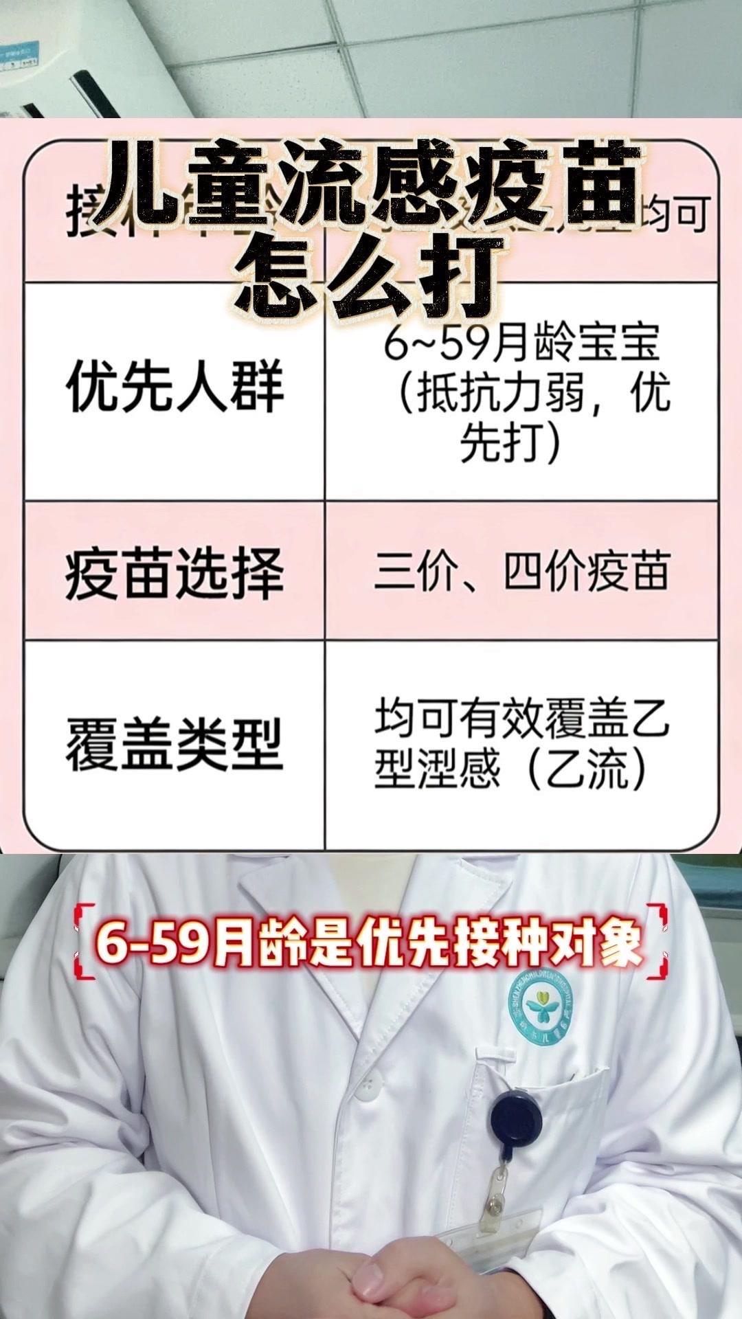 近期乙流占比超50%,北方甚至达到58.2%,预防乙流最安全有效的方法就是打流感疫苗。6月龄以上的娃都能接种,其中6-59月龄是优先对象,小月龄宝宝抵抗力弱,一定要及时接种。 首次接种的6月龄到8岁娃需打两剂,间隔至少4周;已接种过的,则只打一剂就行。9岁以下的娃娃,无论是三价还是四价疫苗,都能覆盖,可自愿选择。 另外,6月龄以下宝宝的家人、看护人也一定要接种,形成家庭免疫屏障,才能全方位保护宝宝。