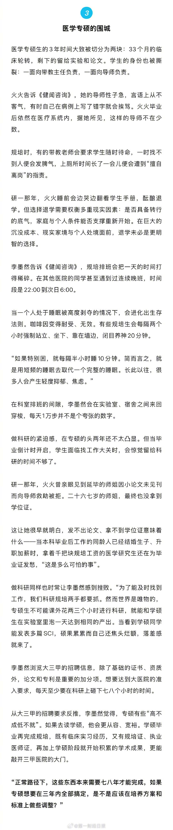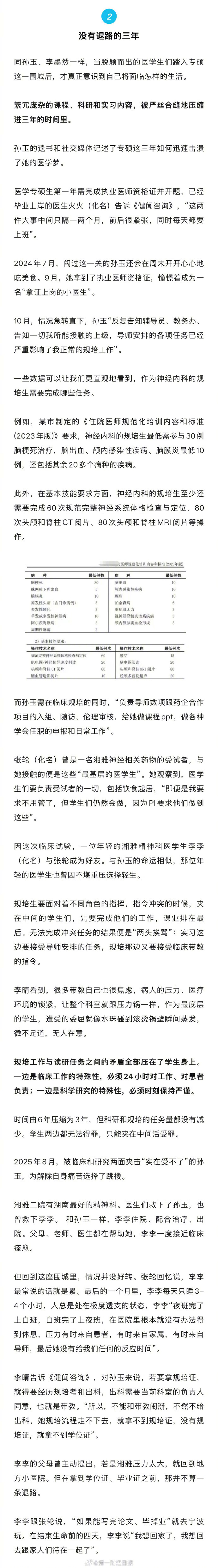 【湘雅医学生坠江:医学梦女孩倒在了八年长跑的终点前】遗书社交媒体记述坠江研究生的医学梦碎一名医学研究生在25岁的青春年华逝去。3月14日晚23时,长沙警方发现橘子洲大桥有人坠江。第二天下午,坠江者被打捞上岸,经确认为中南大学湘雅医学院2023级研究生孙玉(化名)。没有退路惧怕淘汰专硕医学生的困境