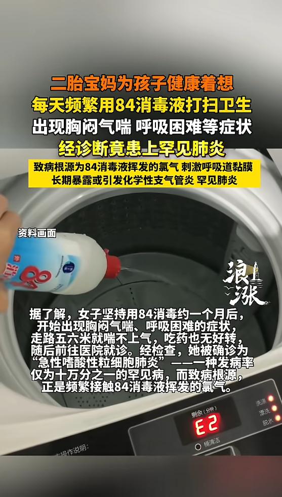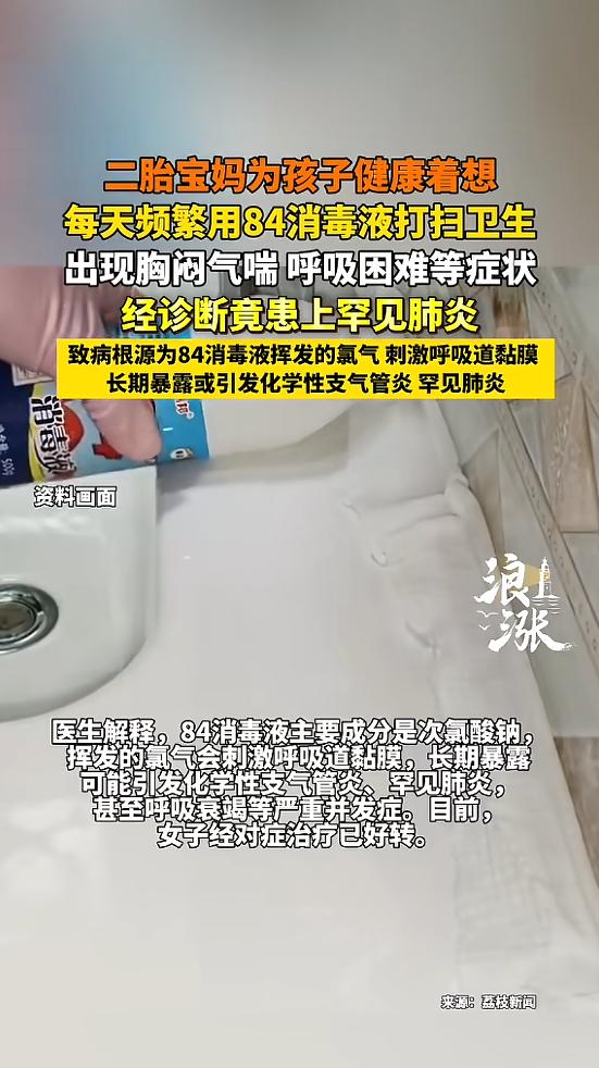 “太吓人了!”江苏淮安,一女子为了宝宝健康,每天用84消毒液打扫卫生,坚持了约一个月后,女子开始胸闷气短,并且走五六米就喘不上气,去医院检查,竟被急性嗜酸性粒细胞肺炎,这病的发病率仅为十万分之一!网友:心真大! 江苏淮安发生的这件事,看着就让人揪心,不少有娃家庭看完都忍不住捏了把汗。 一位一心想给宝宝打造无菌环境的宝妈,因为过度消毒,把自己折腾进了医院,还患上了发病率极低的罕见病,实在是好心办了坏事。 这位宝妈的初衷特别纯粹,就是担心家里有细菌病毒,会影响小宝宝的身体健康。 毕竟孩子抵抗力弱,家长总想把一切隐患都隔绝在外,于是她把84消毒液当成了日常清洁的“必备神器”,每天都会用它擦拭家具、拖地、消杀居家各个角落,这份细致整整坚持了将近一个月。 刚开始的时候,宝妈并没觉得有什么异样,只觉得消毒到位了心里更踏实。 可随着时间推移,身体慢慢发出了预警信号,她开始频繁觉得胸闷气短,呼吸越来越不顺畅,后来甚至发展到走五六米的短距离,就喘得厉害,连正常活动都变得费劲。 察觉到身体不对劲后,她赶紧去医院做检查,这一查结果让所有人都吓了一跳。 经过专业诊断,宝妈被确诊为急性嗜酸性粒细胞肺炎,这种病的发病率仅有十万分之一,属于十分罕见的呼吸系统疾病。 医生结合病史和检查结果分析,病因就是长期、频繁使用84消毒液,密闭空间里的氯气持续刺激呼吸道,诱发了肺部的异常反应,最终引发了这场罕见病症。 事情传到网上后,网友们议论纷纷,看法也分成了两派。 有网友心疼地说:“当妈真的太不容易了,满心满眼都是孩子,没想到过度在意反而伤了自己,太让人心疼了。” 也有网友直言:“这就是消毒过度了,心是好的但常识没跟上,日常清洁根本没必要天天用84,反而害了自己。” 其实这件事也给所有家长,甚至所有居家消杀的人提了个醒,爱孩子、注重卫生本身没有错,但凡事都要把握好度,科学防护才是真正对家人负责。 84消毒液属于含氯消毒剂,本身具有较强的刺激性,长期在密闭环境里高频次使用,挥发的气体很容易损伤呼吸道黏膜,尤其是体质敏感的人群,更容易出现不适反应。 日常居家环境,只要做好基础的清洁,保持开窗通风、空气流通,就能减少细菌滋生,没必要天天依赖强效消毒剂。 只有在接触过外界污染物、有明确消杀需求时,再合理使用消毒液,而且使用时一定要注意开窗散味,避免长时间待在消杀后的密闭空间里。 家长总想给孩子百分百的安全,这份心情可以理解,但过度防护往往会适得其反。 比起追求“无菌环境”,适度清洁、科学防护,兼顾家人的身体健康,才是更稳妥的方式。 对此您有什么不同的看法,可以在评论区留言讨论!!! 信息来源:《宝妈每天用84消毒患上罕见病 医生回应宝妈每天用84消毒患罕见病》浪涨新闻