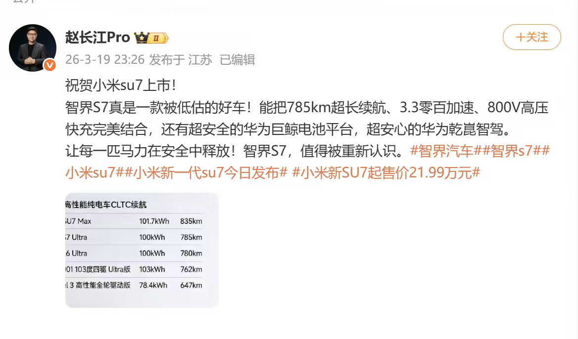 赵长江为旗下车型正名,赵长江称智界S7被严重低估。智界S7以华为硬核技术打底,安全、智能、续航、加速、快充全面在线,综合实力被严重忽视,赵长江说智界S7是一款被低估的好车。