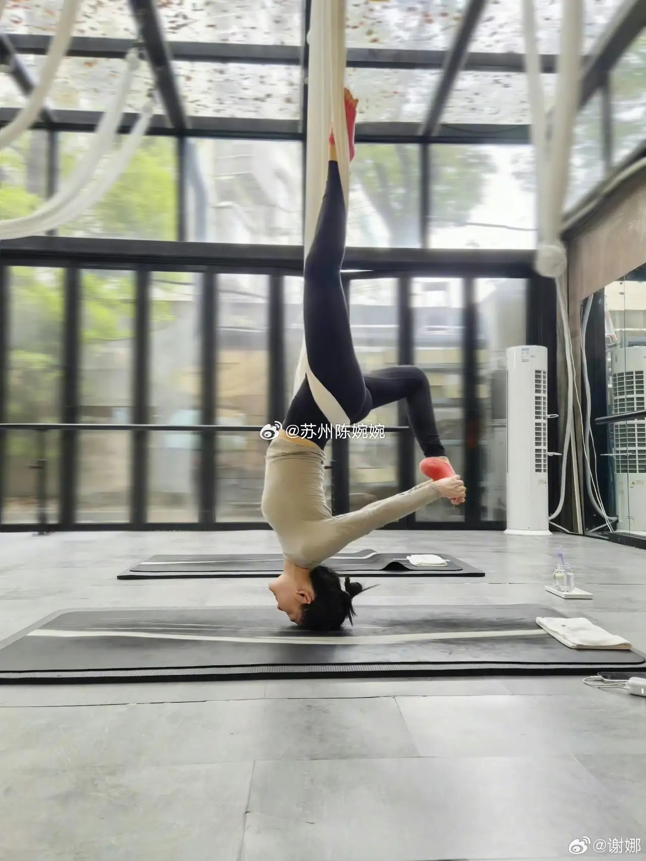 谢娜在社交媒体发布的图片中显示,谢娜身着瑜伽服饰,空中展示倒立、撇叉动作,身形轻盈;并配文称“换个角度看世界,保持身体柔软,才能迎接新的挑战!”