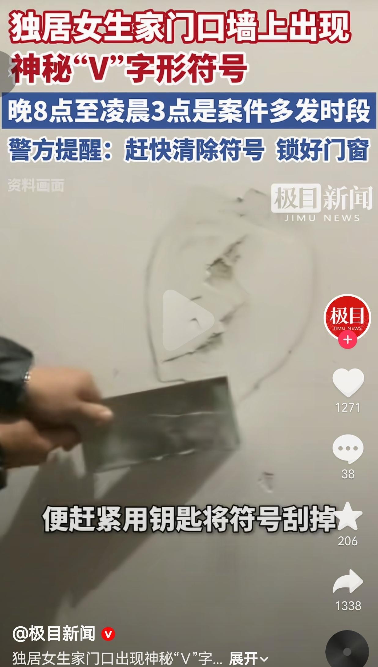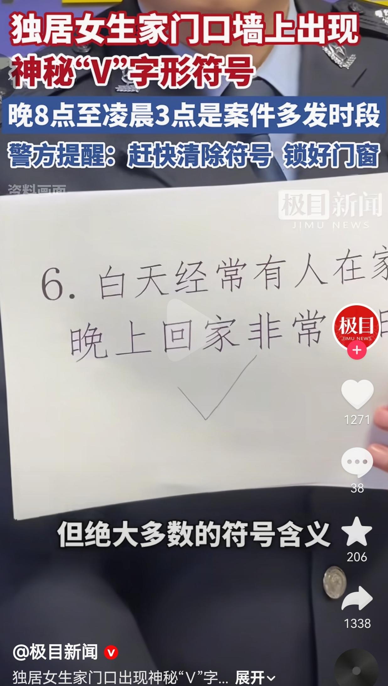 独居女生家门口惊现神秘“V”字形状!小偷踩点标记太吓人,警方紧急提醒! 看完我后背直冒冷汗!家住华中某地独居女生小周,回家拿东西时竟在门口墙上发现一个黑色记号笔写的“V”字,一查才知道——这是小偷踩点留下的标记! 小周当时吓得魂都飞了,赶紧用钥匙把符号刮掉,紧接着报警。警方一查才说,这个“V”在小偷黑话里,大概率是“白天有人、晚上准点回家”的意思,专门给同伙递信号! 更吓人的是,晚8点到凌晨3点是这类案件高发时段,独居女性简直是小偷眼里的“软柿子”! 之前还有新闻说,小偷会在门上画圈、打叉、画三角,每个符号都藏着坏心眼:有人在家、没人在家、家里有钱、好下手……全是踩点的暗语!小周这波要是没发现,指不定哪天就被小偷摸进门了! 警方还特意强调:除了门口,阳台、厨房、卫生间的窗户也得盯紧!夜间一定要锁好门窗,锁门就用传统插销,这才是最安全的;有条件的姐妹,一定要备个报警器,真遇到事能救命!   网友们看完直接炸锅,评论区全是后怕,有的网友说:“我上周也在门口发现个类似的符号!当时没当回事,现在赶紧回去刮掉!独居女生太惨了!” 也有的网友说:“想起之前看的新闻,有人家门口被画了圈,第二天就被盗了!姐妹们一定要警惕家门口的奇怪符号!” 也有的网友说: “我也是独居,现在出门都要反复检查门有没有锁好,看到这新闻更慌了!必须给物业提意见装监控!” 还有的网友说:“小周太机智了!发现就赶紧刮掉还报警,换我可能都反应不过来,给她点个赞!” 要我说,这些小偷太缺德了!专挑独居女生下手,就因为知道女孩子势单力薄,不敢反抗!他们躲在暗处画符号、踩点,把别人的家当成自己的“提款机”,完全不顾别人的恐惧和安危! 更让人揪心的是,很多独居女生平时就没安全感,现在连家门口都要提心吊胆,生怕被小偷盯上!这不是矫情,是真的怕——怕财产损失,更怕人身安全受威胁! 警方提醒得对:发现不明符号立刻清除,锁好门窗,赶紧报警!别觉得“我家没值钱东西”就大意,小偷要的从来不是那点钱,是你的安全感!插销、报警器这些小物件,平时看着不起眼,真到了关键时刻,就是能护你周全的铠甲!   独居从来不是“原罪”,但坏人总盯着我们的脆弱! 我们能做的,就是多留一个心眼:出门检查门锁,睡前反锁门窗,发现奇怪符号别犹豫,直接清除+报警!别给坏人任何可乘之机! 你要知道:“你的安全,从来都不是小事!警惕家门口的每一个奇怪符号,锁好每一扇窗,就是保护自己的第一道防线!” 对此,你怎么看?