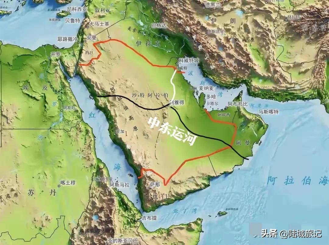 【中东运河超级工程!】:①近期,围绕伊朗和以色列以及美国的战争在持续恶化,全球石油通道霍尔木兹海峡被伊朗封锁,波斯湾沿岸石油出口国家深受战事影响,同时也门胡塞武装封锁亚丁湾和红海,进出亚欧商贸通道苏伊士运河也收到波及。 ②为了打破未来国际航道被区域战争影响,同时推动中东沙漠治理和推动“中国基建”,打造“中国超级工程”——中东运河设想工程就此诞生。 ③“中东运河”首先要避开波斯湾和霍尔木兹海峡受伊朗把控的因素,也要避免受也门胡塞武装侵扰的红海情况,故在沙特与阿曼两个国家之间修建一条运河航道。(运河路线如下图2) ④“中东运河”工程线路:起点位于阿曼的阿拉伯海沿岸低洼区域,一路北上进入沙特境内,经沙特首都利雅得,再一路向西北开挖,穿越阿拉伯高原,进入红海沿岸的吉达港或者延布港,打通红海至阿拉伯海的航线,同时中东运河以沙特首都利雅得为核心向东北连接科威特,形成阿拉伯半岛互通运河,解决和缓解运输面积的情况。 ⑤“中东运河”航道工程的生态功能:运河输送的不仅仅有商船,同时水汽也运送至阿拉伯半岛内陆,缓解内陆干旱情况,对沙特首都利雅得更是十分有利,此外也可以推动包括阿曼、沙特等国家从运河获取更多利益。