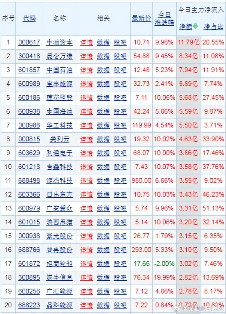 多元金融:板块异动中油资本午后垂直涨停。作为国资:中石油旗下金融平台,受益于能源企业资本运作预期升温。其单日获:超11.79亿元主力资金净流入,位列两市第一 。