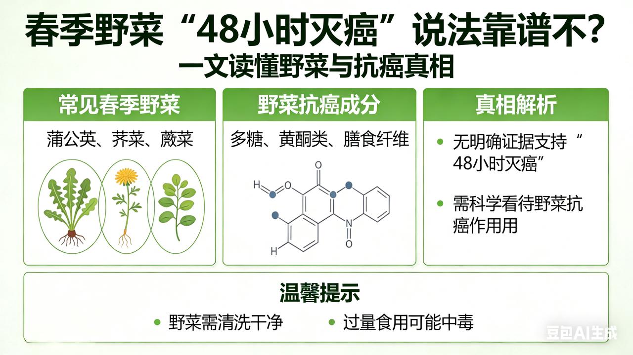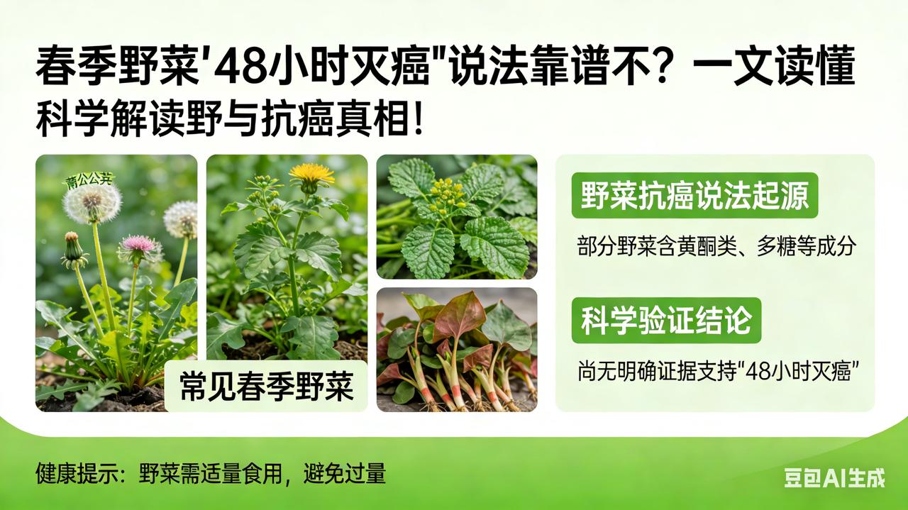 春季野菜“48小时灭癌”说法靠谱不?一文读懂野菜与抗癌真相! 春季野菜“抗癌神话”大揭秘:蒲公英48小时灭癌98%?真相让你惊掉下巴! 春日,宛如一位神奇的画师,用温暖的笔触勾勒出一幅生机勃勃的画卷。鲜嫩的野菜如灵动的精灵,从沉睡的大地中纷纷探出头来,瞬间成为餐桌上的“顶流明星”。在这群野菜“天团”里,蒲公英恰似那最耀眼的C位担当,备受众人追捧。然而,最近网络上却炸开了锅,一则“蒲公英能在48小时内杀死98%癌细胞”的消息如狂风骤雨般席卷而来,瞬间点燃了大众的好奇心与期待。这究竟是上天赐予人类的抗癌“超级秘宝”,还是一场精心策划、荒诞至极的骗局?快跟着我一起深入探寻,揭开这神秘得如同迷雾般的面纱! 科研“曙光”:实验室里的惊人“魔法” 在加拿大温莎大学那充满神秘与探索气息的实验室里,一群执着于攻克癌症难题的科研人员,就像一群无畏的勇士,在未知的科学领域中披荆斩棘、奋勇前行。一次偶然的机会,他们发现蒲公英根提取物仿佛是一把拥有神奇魔力的“钥匙”,对某些特定类型的白血病细胞有着诱导凋亡的奇妙作用。想象一下,在显微镜那微观的世界里,原本张牙舞爪、肆意疯狂生长的癌细胞,在蒲公英根提取物的“攻击”下,就像被施了定身咒的邪恶恶魔,一点点失去活力,逐渐走向毁灭[3][4]。这一发现,如同在黑暗无边的抗癌道路上突然亮起了一盏璀璨明灯,给无数在绝望深渊中挣扎的癌症患者和家属带来了一丝希望的曙光,仿佛看到了战胜癌症的胜利旗帜就在前方飘扬。 谣言“狂欢”:自媒体的“疯狂炒作盛宴” 然而,现实却总是充满了戏剧性,就像一场荒诞的闹剧。这一原本严谨、科学的科研成果,在经过一些自媒体的“添油加醋”“断章取义”和“疯狂炒作”后,彻底变了味,仿佛被施了邪恶的魔法。 “蒲公英48小时内杀死98%癌细胞”这一耸人听闻的说法,就像一颗重磅炸弹,在网络世界中掀起了轩然大波,引发了一场前所未有的“狂欢盛宴”。自媒体们为了吸引流量、博眼球,不惜夸大其词、无中生有,将实验室里的小范围研究成果无限放大,仿佛蒲公英已经成为了战胜癌症的“无敌神器”,能瞬间让癌症消失得无影无踪。一时间,各种夸大其词的标题和文章铺天盖地,像潮水一般涌来,让人眼花缭乱。不少人被这些虚假信息迷惑,信以为真,纷纷加入到抢购蒲公英的“疯狂大军”中,仿佛错过蒲公英就错过了战胜癌症的唯一机会。 现实“落差”:体外实验与临床的“天壤鸿沟” 但我们必须要清醒地认识到,体外实验和临床效果之间,就像隔着一道无法跨越的巨大鸿沟,有着天壤之别。体外实验就像是在一个精心搭建的、完美无缺的“梦幻舞台”上进行的精彩表演,科研人员可以在培养皿中,使用高浓度的蒲公英根提取物直接作用于癌细胞,就像在舞台上精准地操控着木偶,一切都在掌控之中。可人体却是一个极其复杂、神秘莫测的“宇宙”,药物进入体内后,要经过吸收、分布、代谢、排泄等多个复杂得如同迷宫般的环节,还会受到各种生理和病理因素的影响,就像一艘在茫茫大海中航行的船只,会遇到各种狂风暴雨、惊涛骇浪和暗礁险滩[3][6]。而且,截至目前,没有任何一项权威的临床研究能够证实蒲公英具有治疗癌症的功效,更别提“48小时杀死98%癌细胞”这种不切实际、异想天开的说法了[3]。这就好比在实验室里造出了一艘超级飞船,看似无比强大,但在现实的宇宙环境中,它未必能顺利飞行,甚至可能会迷失方向,坠入无尽的黑暗深渊。 食用“陷阱”:并非人人都能“畅享盛宴” 更让人担忧的是,蒲公英并非适合所有人食用,它就像一个带着刺的玫瑰,看似美好,实则暗藏危险。它具有利胆和利尿的作用,对于患有胆结石、肾功能异常以及胃酸过多的人来说,食用蒲公英就像是在身体里埋下了一颗“定时炸弹”,随时可能爆炸,刺激身体,加重病情[6]。曾经有一位张大爷,听闻蒲公英能抗癌,便每天大量食用蒲公英,满心期待着能战胜癌症。结果,身体不仅没有好转,反而出现了腹痛、腹泻等症状,整个人虚弱不堪,最后不得不去医院接受治疗。这就是盲目食用的后果,就像在没有地图、没有向导的情况下闯入一片未知的、充满危险的森林,很容易迷失方向,陷入绝境,无法自拔[2]。 蒲公英虽有一定的药用价值,但它绝不是抗癌“神药”。面对网络上各种夸张的健康传闻,我们一定要保持理性和警惕,不要被虚假信息所迷惑,盲目跟风。在追求健康的道路上,遵循科学的方法和专业的建议才是关键。让我们用理性的眼光看待蒲公英,别让它从“餐桌新宠”变成“健康杀手”,守护好自己和家人的健康,共同迎接美好的未来!