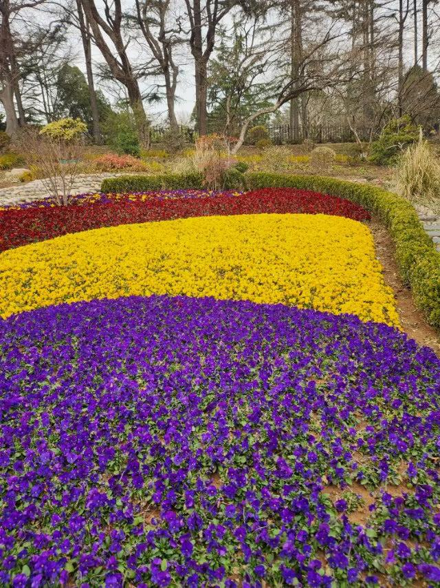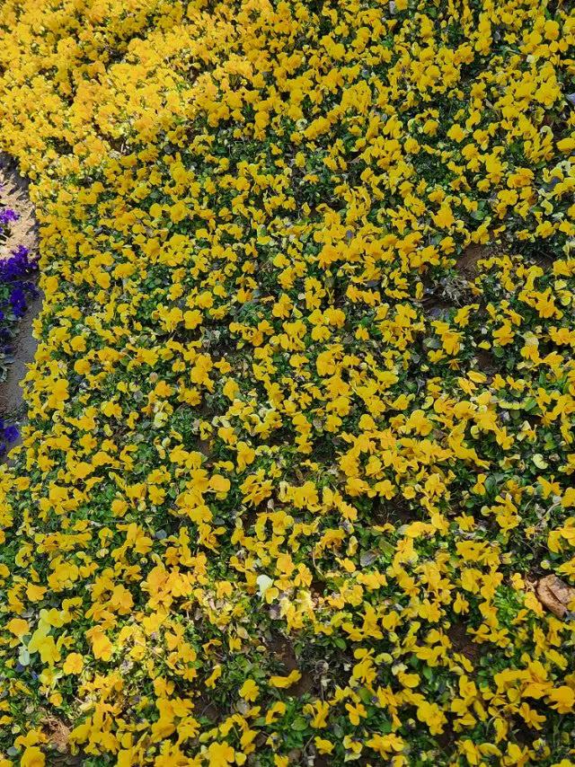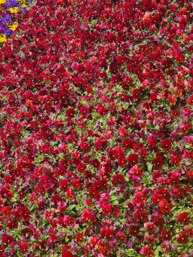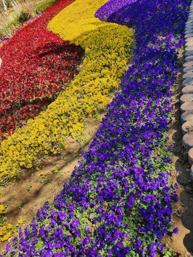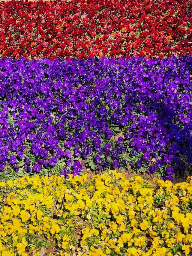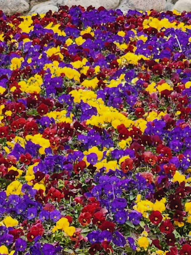 三色堇如彩虹般绚丽多彩,点亮了大地的生机,等你来欣赏。 青岛百花苑公园里,三色堇有红、黄、紫三色的花,美丽而娇艳,如初恋的心动、又如爱情里浪漫的故事,诉说着思念和等待你前来观望。 现在正是三色堇花开放的季节,请友友们快来观赏一下吧! 花坛三角梅 紫色鼠尾草花海 黄绿色系花卉 三色堇图 三色堇组合