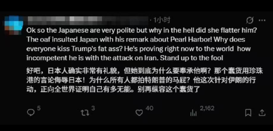 昨天,高市早苗访美期间,在白宫公开夸赞特朗普儿子又高又帅、基因优秀,还特意把对方生日和美国250周年相提并论,场面十分刻意。此举立刻被网友吐槽太谄媚,不少人直言日本外交姿态放得太低。也有网友看得明白:面对吃软不吃硬的特朗普,吹捧就是最实用的外交技巧。高市这波操作,看似丢面子,实则是在为日美同盟铺路。 高市早苗这波“花式夸人”,表面是客套,实则是日本当下最现实的生存策略。特朗普吃软不吃硬、重情绪轻规则,高市精准拿捏这点,用恭维换态度、用姿态换利益,比强硬对抗划算得多。回顾历史,日本长期在大国之间走平衡路线,安倍时期就把“亲美稳华”玩得熟练,如今高市只是把这套技巧更直白化。当前中东紧张、东亚局势复杂,日本急需美国安保承诺,只能在外交姿态上让步。看似谄媚,实则是小国在大国博弈里的无奈选择。比起面子,日本更想保住同盟、军费、贸易优惠,这才是高市放低姿态的真正目的!