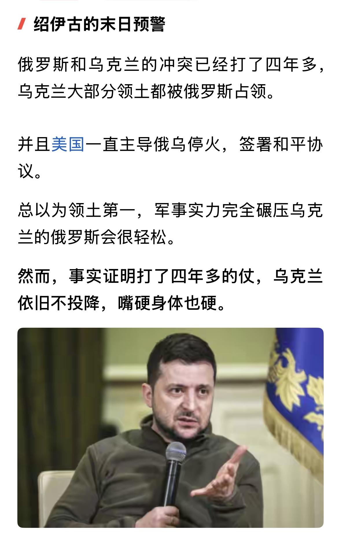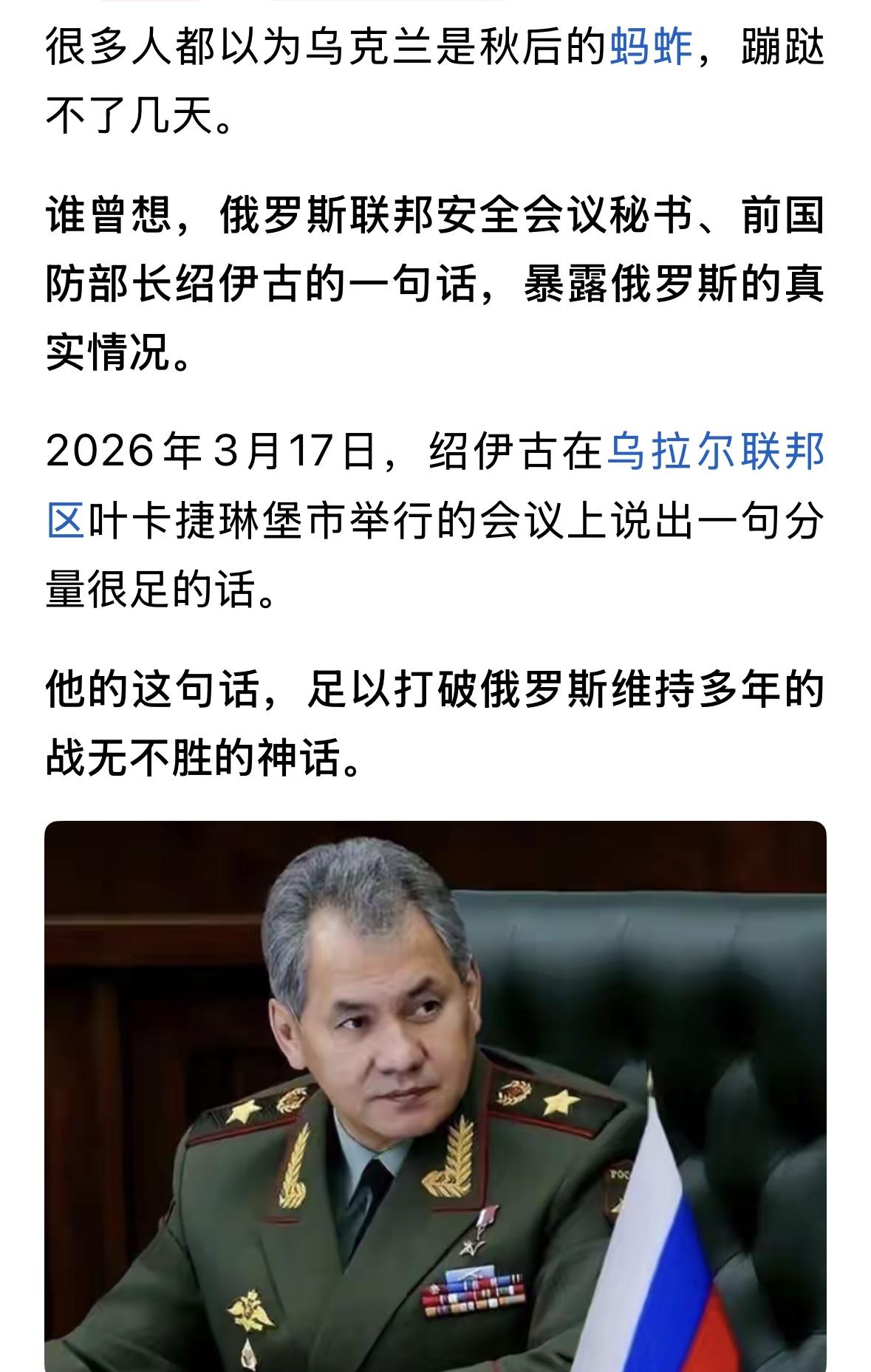 绍伊古首次表态,俄或有悲剧后果,可能出现中国不愿看到的一幕。俄罗斯四年拿不下乌克