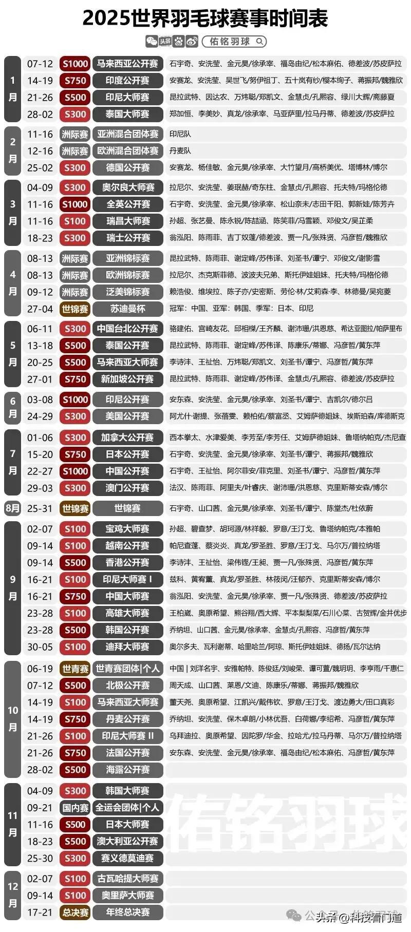 计划明年推出双打世界杯,把男双女双混双打包放在一起举办,这对乒乓球运动是好事,但是对现在青黄不接的国乒来说显然是不利的! 国乒上一个男双世界冠军是小胖头组合,再往前是龙头组合,而马龙退役,樊振东远走德甲。虽然双打世界杯还有一年时间,樊振东是否回归国乒仍有一定可能,但双打是需要熟练配合的,最起码需要赛前集训,这样小胖头组合难度大大增加。 此外,王楚钦和孙颖莎极有可能继续出战混双,去争取真正的混双大满贯,所以混双夺金可能极大,但男双无疑要推出小胖头之外的新组合。 目前已知的国乒新生代男左还有2025年出生的黄友政和陈俊菘。黄友政的杀气不够,因此他需要一个类似于马龙这样的男右带领,目前国乒年轻一代只有温瑞博符合这个条件。未尝不是一种选择。 而陈俊菘是颗粒打法,对于生手非常有威胁,不过一旦对手熟悉了他的打法,很可能他没有发挥空间。当然双打可以有队友的补位,总体上是个替代选择。目前看陈俊菘搭配林诗栋,这样逼的两人都不能退台,或许对小石头改变打法来说,更有好处。 女双现在显然是曼昱组合第一选择,但是钱天一之后女左的缺失,让国乒第二选择陷入迷茫。现在国乒女队主力里面,无论是陈幸同、陈熠、石洵瑶还是王艺迪之间怎么组合,都不具备冲金的竞争力,孙颖莎也一样,不如专心混双。而这几位之后,国乒女队出现了一个断层。这要看更年轻的女左、16岁的姜依依(全运会U19女单女团双料亚军)是否能加速成长。 混双不用说了,肯定是莎头组合还有动漫组合,当然不排除蒯曼和陈垣宇配,因为至少目前看,蒯曼个人也更愿意和陈垣宇配,何况近期陈垣宇的技术和心理也有突破,而小石头反而不适合继续混双,还不如男双对他的要求更高,便于激发他的潜力。 当然也有很多人抱怨乒乓球赛事过于密集,wtt赚钱没够[捂脸] 这个事儿,我们不妨来看看国际羽联的赛事密度,附图三四是今年和去年的赛程,所谓Super1000,500,300赛事,基本上对应wtt冠军赛,球星挑战赛和常规挑战赛。除此之外,无论是国际乒联还是国际羽联都有一大堆的世锦赛,洲际赛。何况,一场羽毛球比赛的强度,远高于乒乓球,相信这个大家不会有异议。[笑哭] 其实职业网球也一样。至于wtt,现在国际乒联主席瑞典人索林直接兼任,明确了wtt就是ITTF的市场化部门,而不是什么国外注册的中国公司,不管你同意不同意,这点也完全洗得干干净净。 所以说,一项运动的普及和市场化,一定是有赛事密度的,也一定是让冠军多元化的。这,对于此前一家独大的国乒来说肯定是不利的,但这就是国际乒联设立双打世界杯的初衷,也是乒乓球在奥运会上获得更重要地位的战略布局。 您说呢?