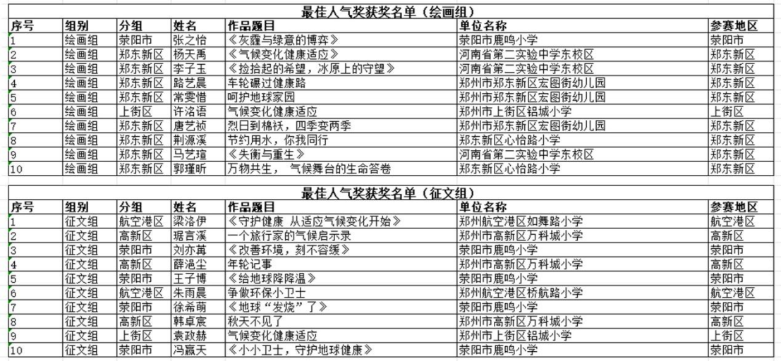 经过公平公正的网络投票筛选与专家评审团综合评议,最终评选出优秀征文作品51份、优秀绘画作品137份、最佳人气作品20份(获奖名单详见文章后)。专家评审团一致认为,本届获奖作品紧扣主题,既精准呈现了极端天气健康影响、脆弱群体防护等核心内容,又融入了青少年对气候行动的独特思考,实现了科学严谨性与艺术感染力的有机融合。从中原区锦江中学刘子涵同学《绿城韧行:于气候变迁中守护健康郑州》中气候变迁对城市影响的详实科普,到郑州市高新区万科城小学薛浥尘笔下年轮记事的直观呈现,再到郑州四中上街校区郭安琦作品中绿色环境的和谐图景,青少年们用文字记录生活智慧,用画笔勾勒适应图景,让气候变化健康适应知识变得通俗易懂、生动鲜活。