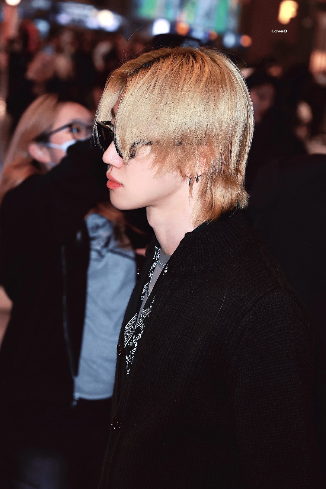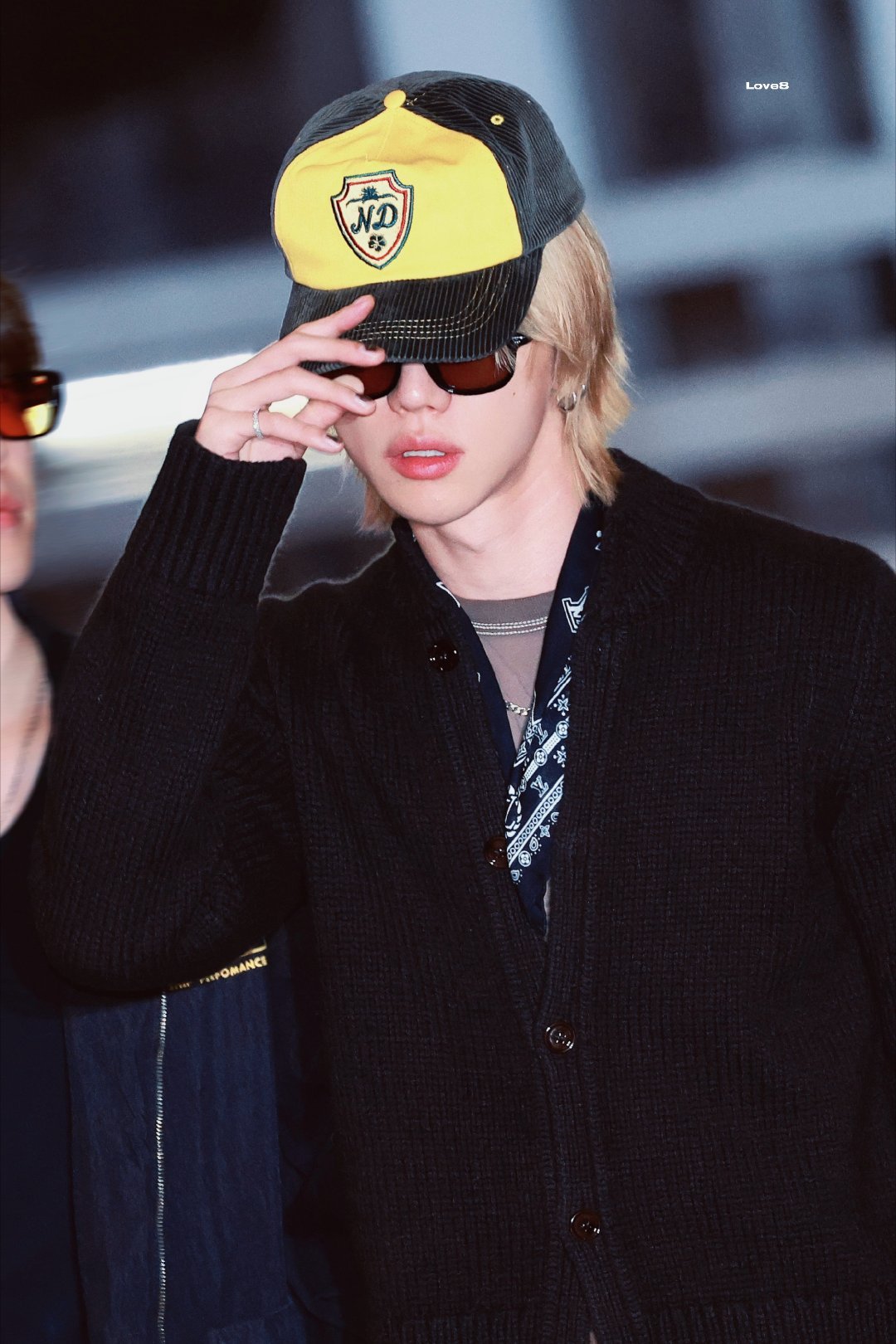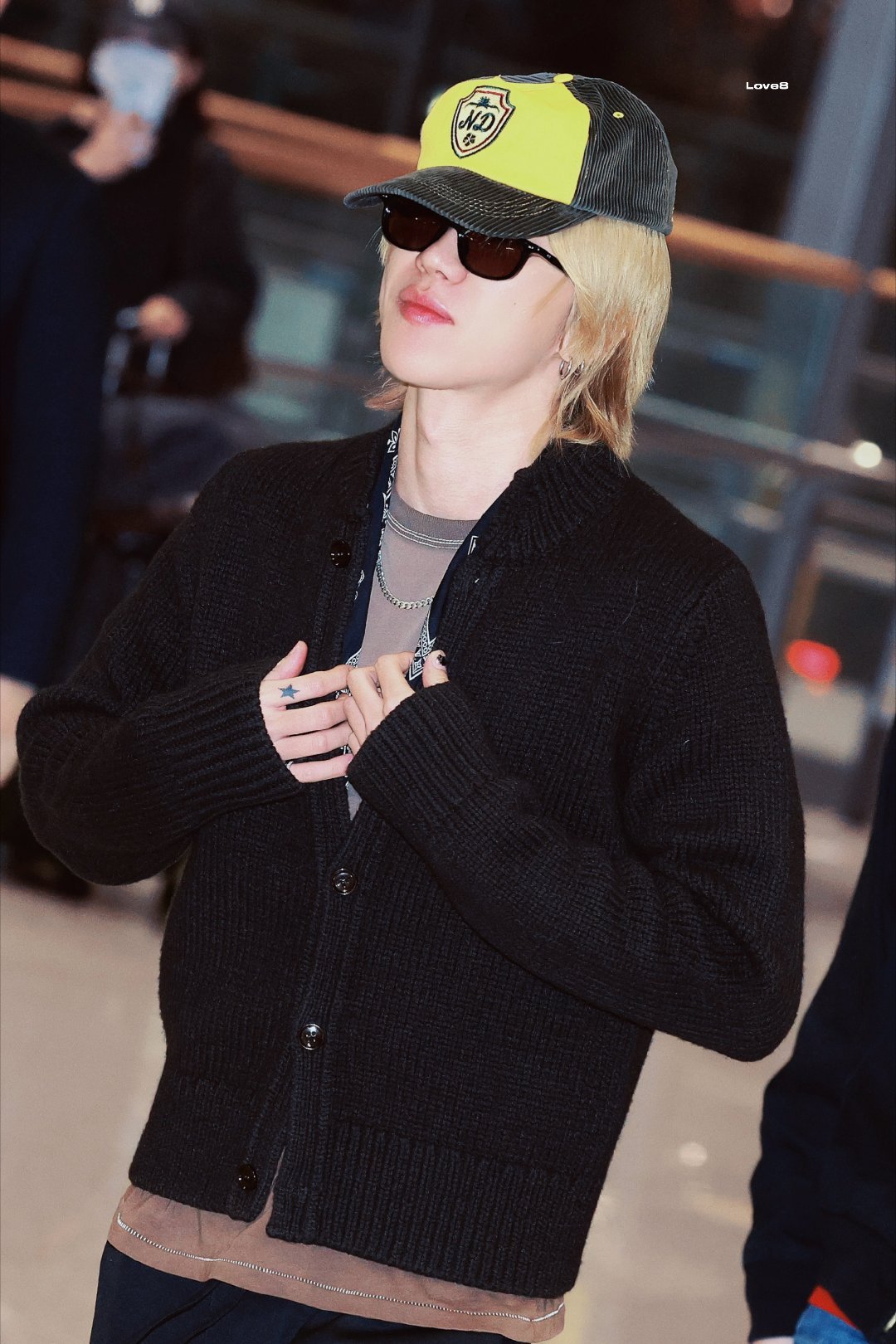 现身机场出发,身着休闲开衫搭配LV丝巾,金发醒目,整体造型融合随性与精致。