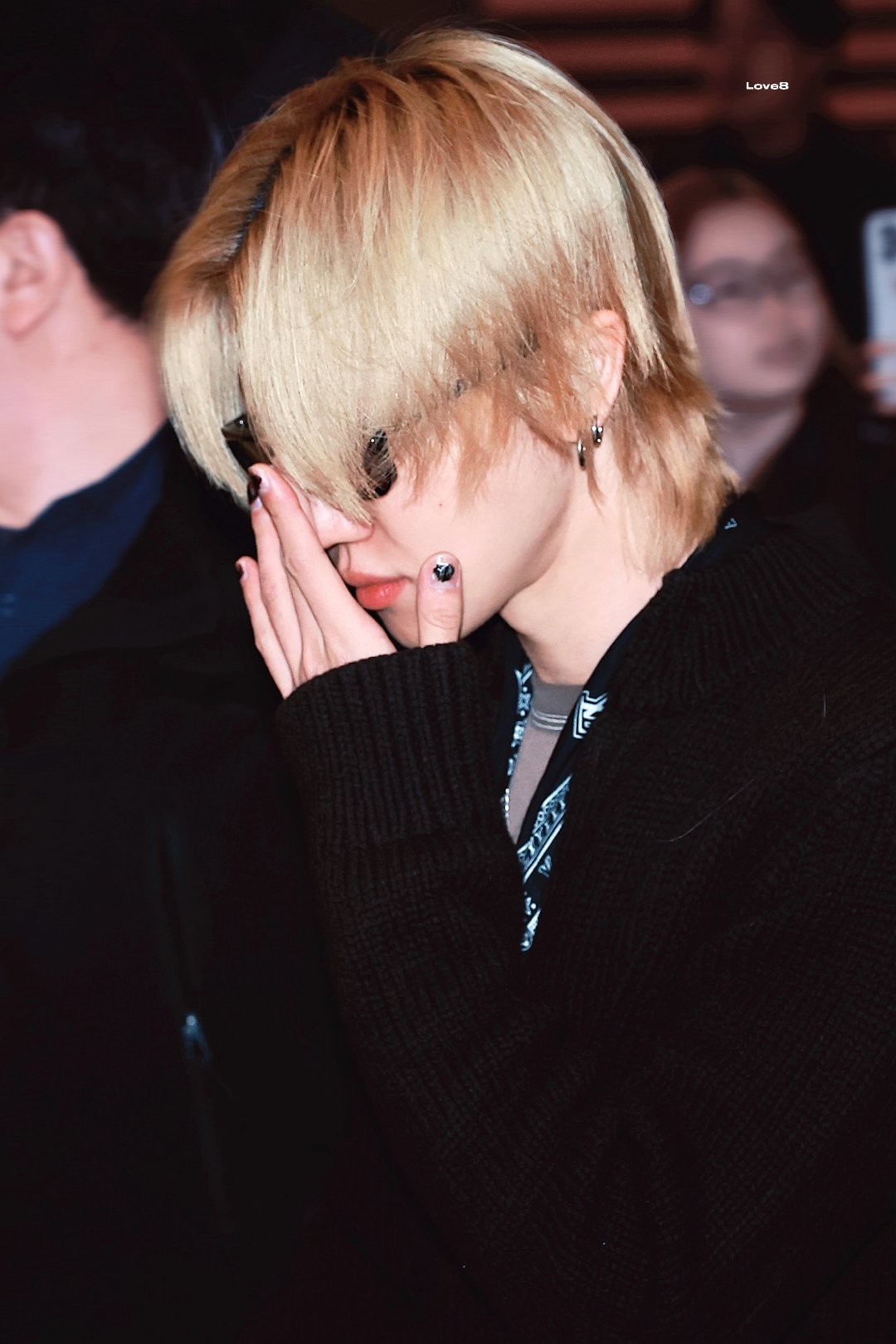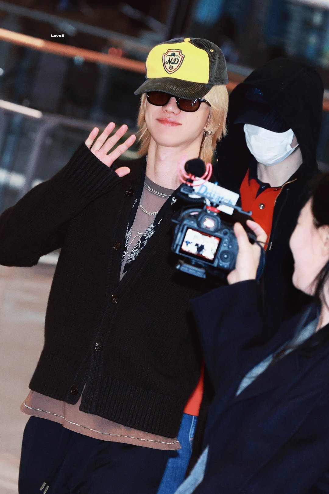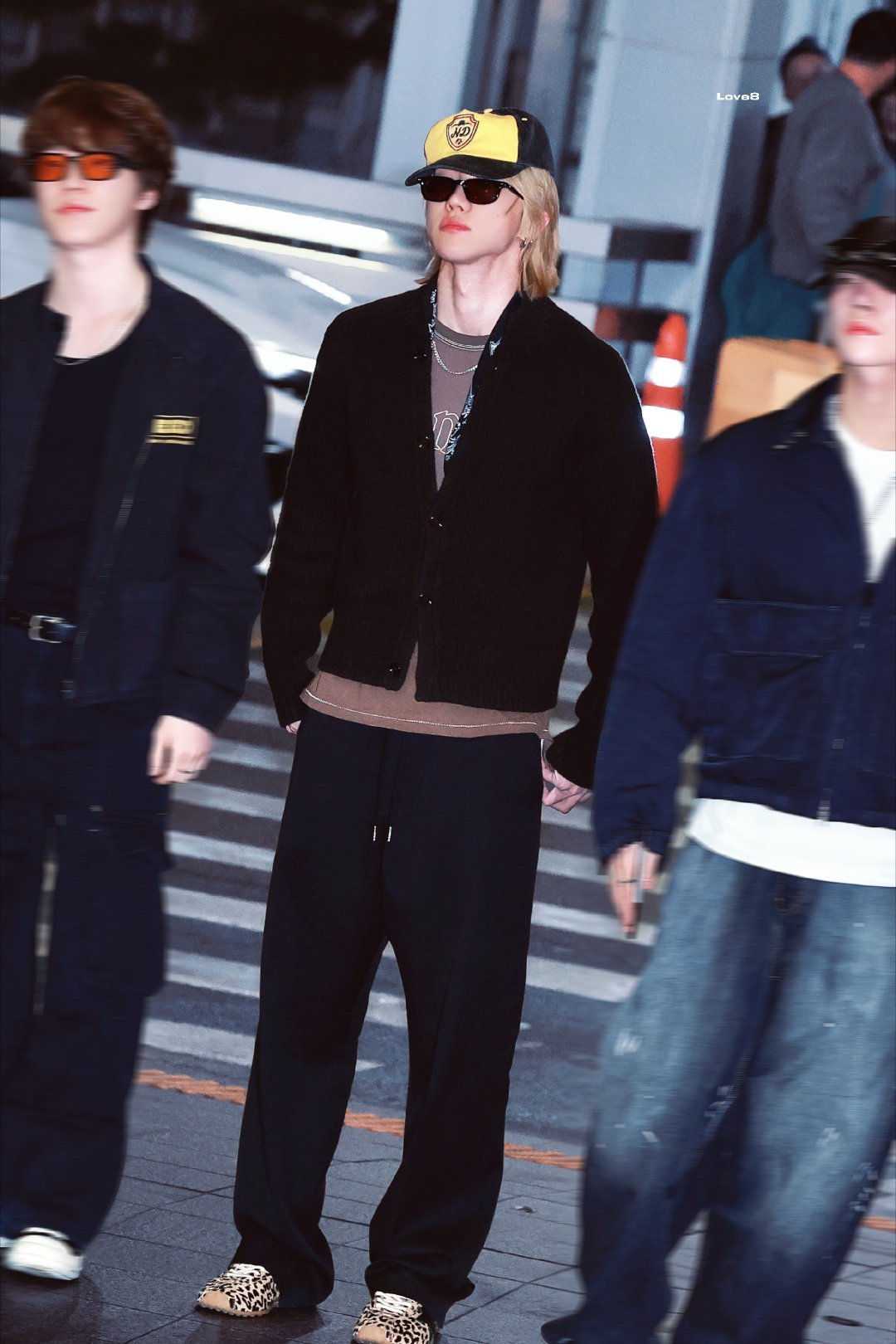 现身机场出发,身着休闲开衫搭配LV丝巾,金发醒目,整体造型融合随性与精致。