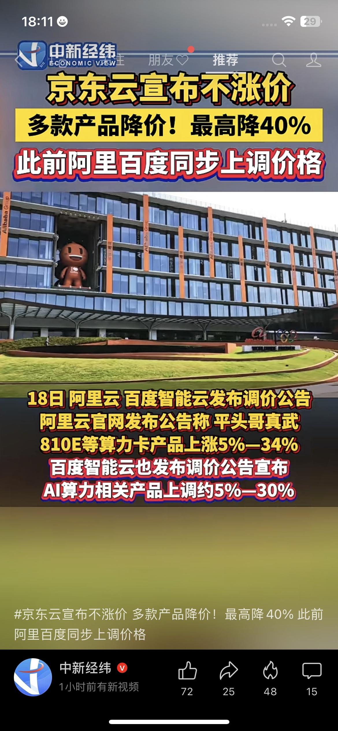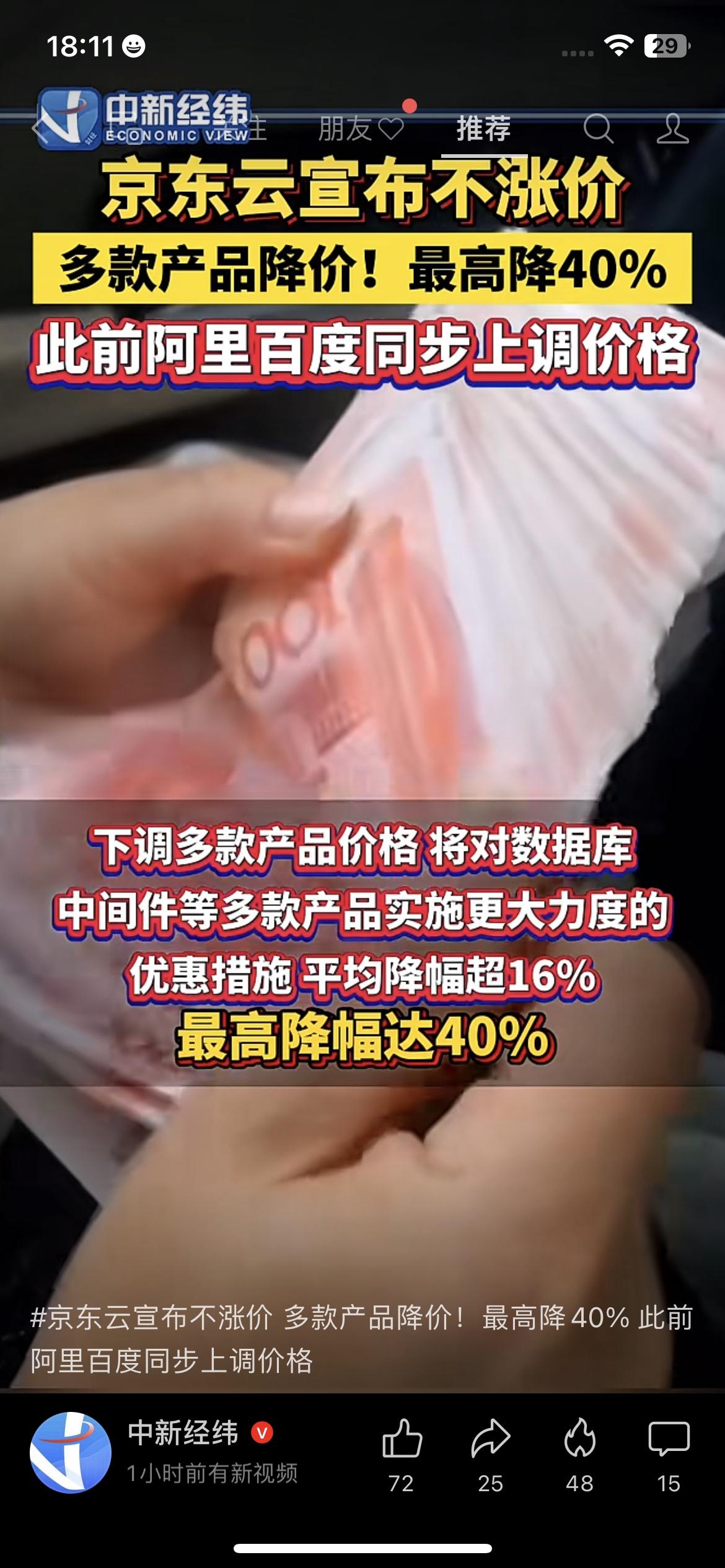 阿里百度涨价,京东云反降40%!这波操作是良心还是套路? 太敢了!阿里、百度刚上调云服务价格,京东云直接反着来:明确不涨价,多款产品最高降40%,平均降幅超16%! 数据库、中间件这些核心产品,直接给客户让利,摆明了要抢市场。 说白了,京东云这是用价格换份额,想在云计算市场分一杯羹。 对咱们普通人来说,虽然不直接用云服务,但这会倒逼整个行业降价,以后中小企业成本降了,咱们买东西、用APP说不定也能跟着沾光。 京东云 云计算 价格战