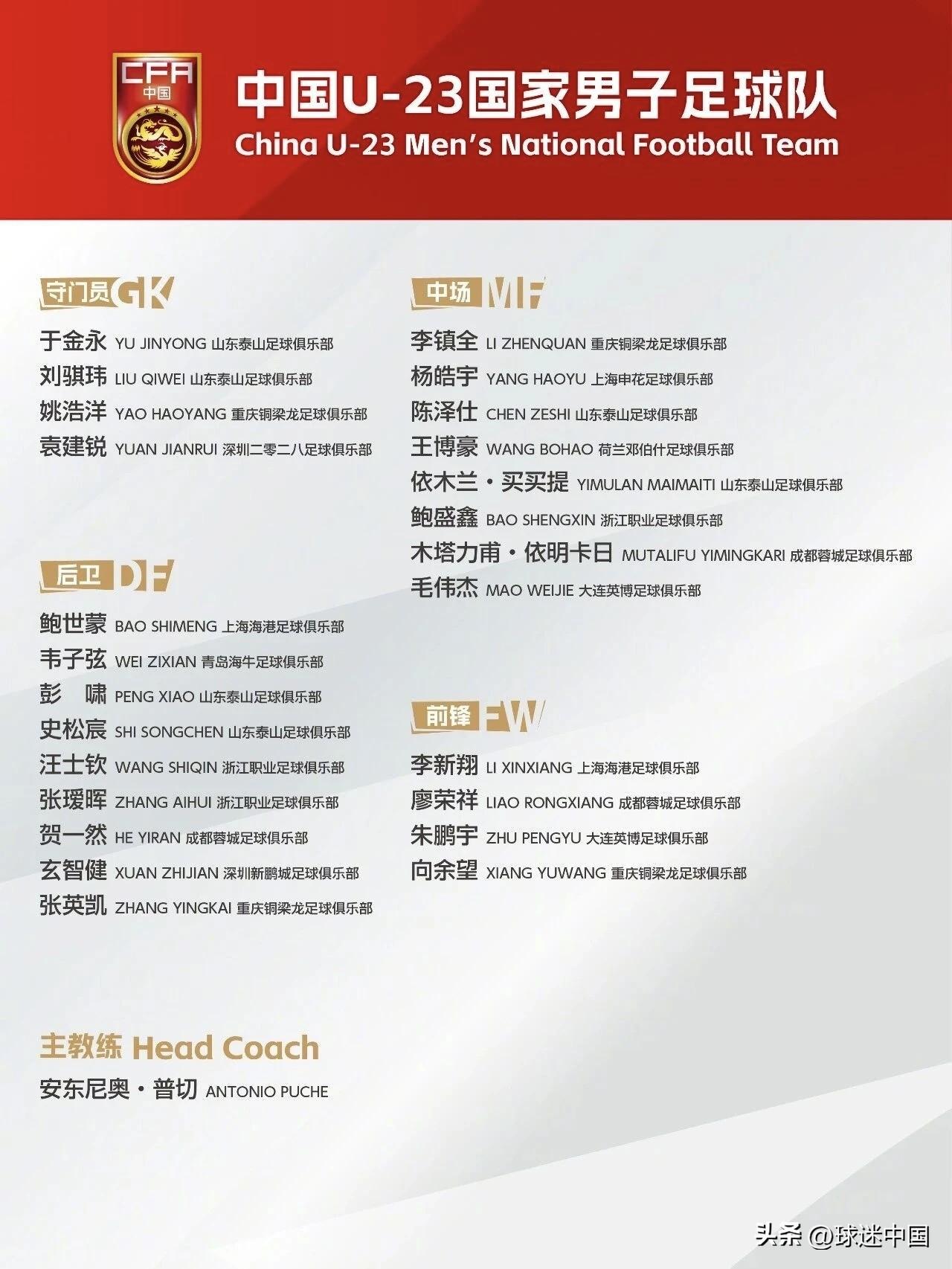 最新一期中国U-23国家男子足球队名单来了!这次从25人缩减到了18人,主教练安