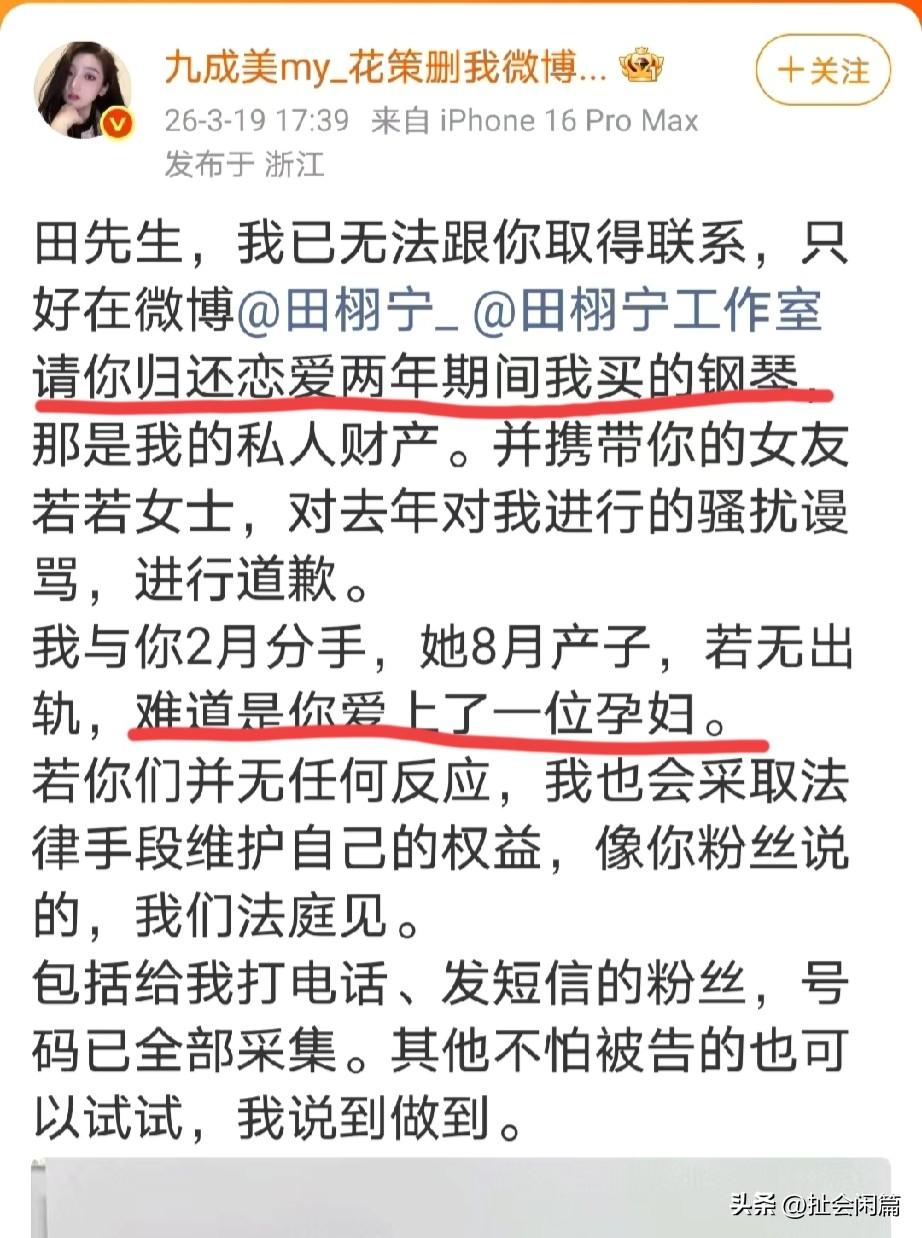 九成美看来是要杠到底了。 又喊话田栩宁归还钢琴,同时带着若若来道歉。 她说除非你爱上的是一个孕妇,不然不可能我们2月份分手,对方8月份生孩子。 ………… 话说这个事儿闹了好长时间,对方田栩宁也表示要起诉她,可是小姑娘并没有善罢甘休,这到底是怎么回事儿啊? 如果你是田栩宁,会怎么处理这一次的危机?