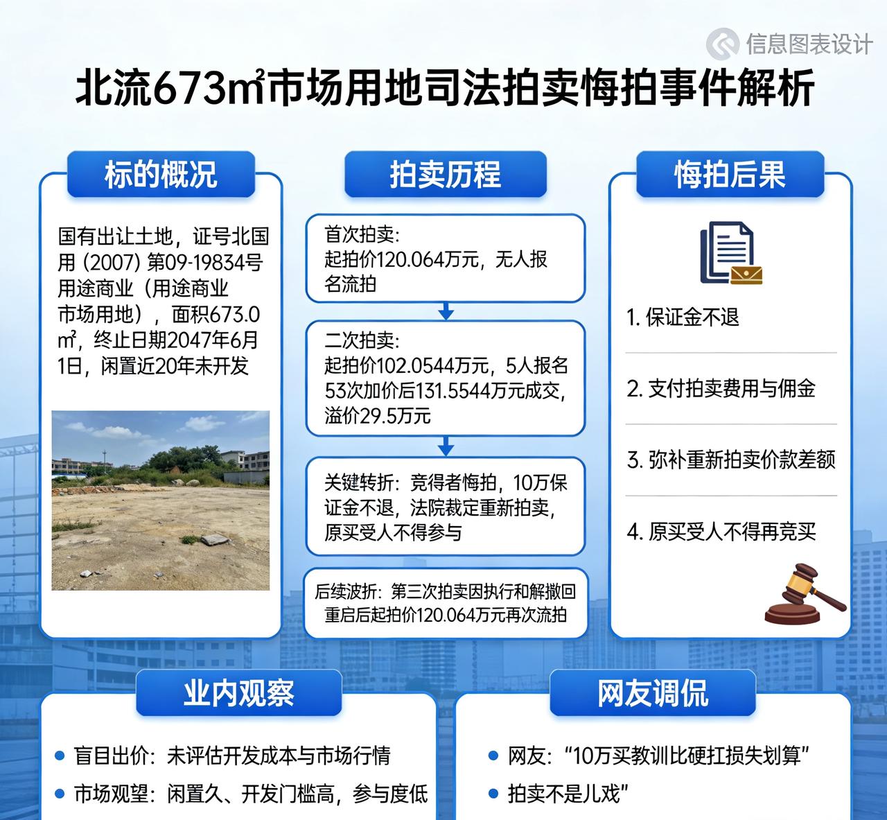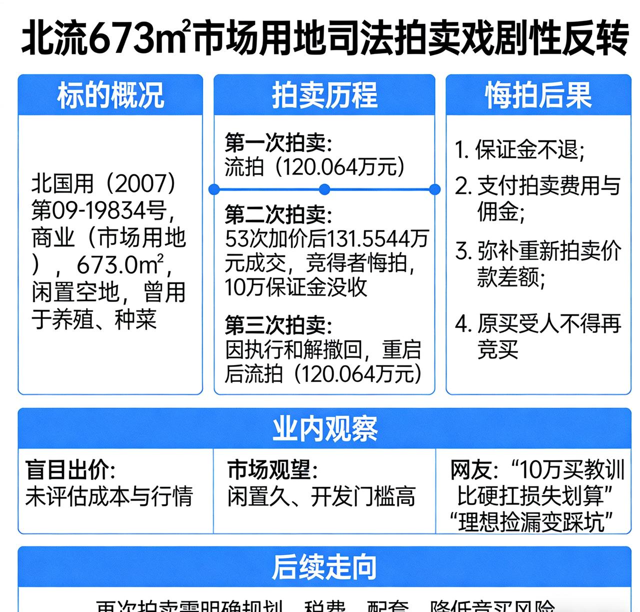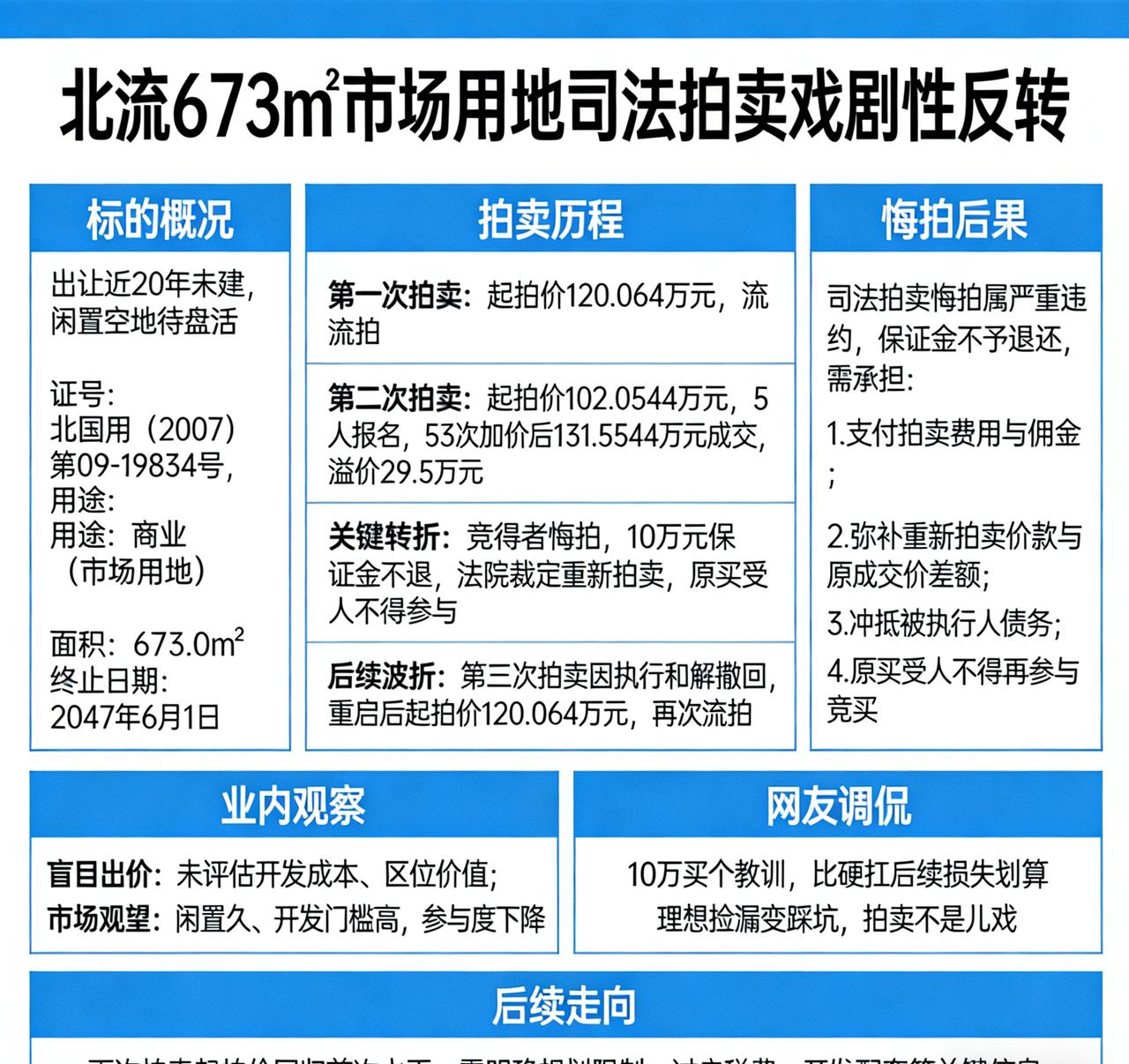 十万元都不要了!北流673㎡市场用地131万成交后遭悔拍。 北流市一宗673㎡商业市场用地的司法拍卖上演“戏剧性反转”:经53次加价以131.5544万元成交后,竞得者突然悔拍,10万元保证金直接放弃,引发业内热议与网友调侃。 标的概况:出让近20年未建,闲置空地待盘活。 该地块为北流市凉亭房地产开发有限责任公司名下国有出让土地,证号北国用(2007)第09-19834号,用途为商业(市场用地),终止日期2047年6月1日,面积673.0㎡。因出让近20年未开发,仍为空地,甚至被用于养殖、种菜,被法院依法处置。 拍卖历程:从流拍到抢手,高价成交再生变 - 第一次拍卖:起拍价120.064万元,因无人报名流拍。 - 第二次拍卖:起拍价降至102.0544万元,吸引5人报名,经53次加价后以131.5544万元成交,溢价约29.5万元。 - 关键转折:成交后竞得者悔拍,10万元保证金不予退还。法院后续裁定重新拍卖,原买受人不得参与。 - 后续波折:第三次拍卖因执行和解撤回,重启后起拍价回升至120.064万元,再次流拍。 悔拍后果:保证金不退,或担多重损失。 司法拍卖悔拍属严重违约,按规定保证金不予退还,且需承担一系列责任: 1. 支付拍卖过程产生的费用与佣金; 2. 弥补重新拍卖价款与原成交价的差额; 3. 冲抵被执行人债务及相关债务; 4. 原买受人不得再参与该标的竞买。 若差额超过保证金,还需补缴,拒不补缴将被法院强制执行。 业内观察:盲目出价与市场理性的博弈。 此次悔拍折射出司法拍卖中的两类典型问题: - 盲目出价:部分竞买人未充分评估地块开发成本、区位价值与市场行情,高价竞得后反悔; - 市场观望:地块虽有商业属性,但闲置久、开发门槛明确,重启后参与度下降,再次流拍。 网友调侃:“10万买个教训,比硬扛后续损失划算”“理想捡漏变踩坑,拍卖不是儿戏”。 后续走向:再次拍卖能否成交成焦点。 目前该地块已进入再次拍卖流程,起拍价回归首次水平。业内分析,需进一步明确地块规划限制、过户税费、开发配套等关键信息,降低竞买风险,才能吸引真正的投资客,避免再次流拍或悔拍。北流农产品市场 玉林土地出售