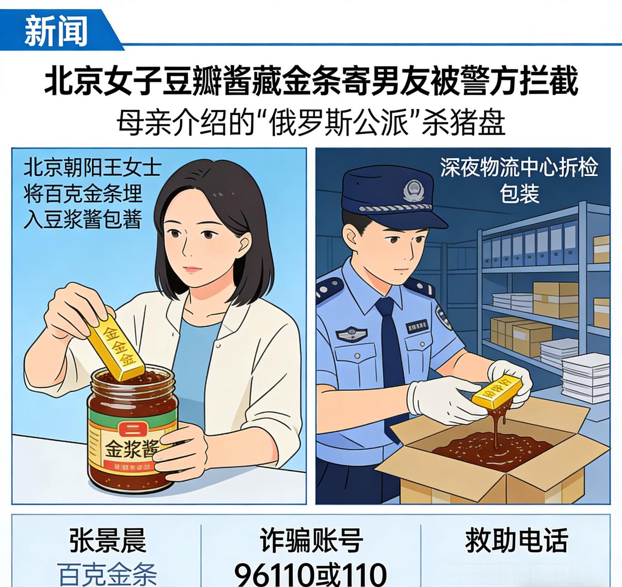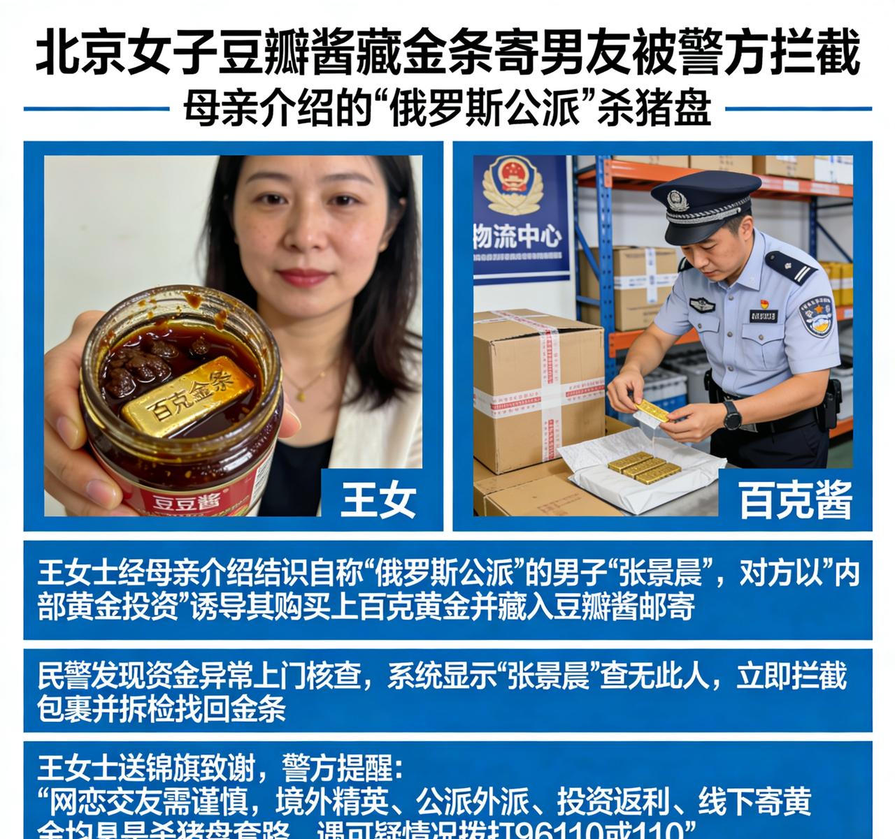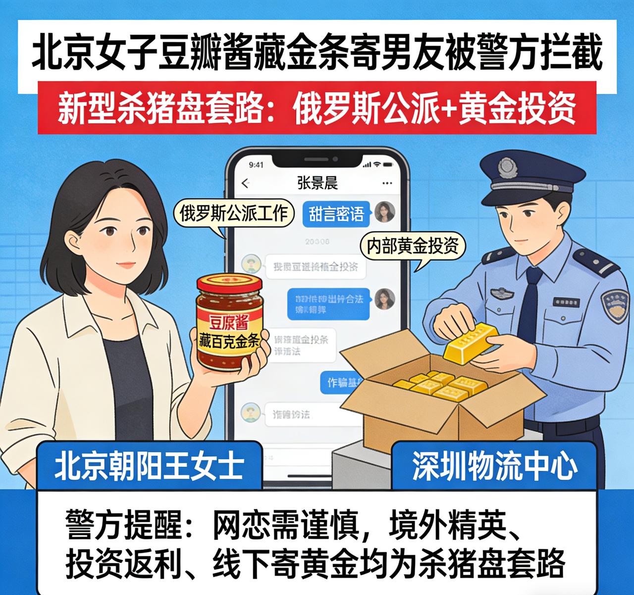 北京一女子豆瓣酱里藏金条寄男友被警方拦截!竟是母亲介绍的“俄罗斯公派”杀猪盘。 北京朝阳王女士遭遇新型杀猪盘,为向“真爱”表忠心,竟将百克金条藏进豆瓣酱快递寄往深圳,所幸被警方紧急拦截,巨额财产惊险挽回。 经警方核查,王女士经母亲介绍结识自称俄罗斯公派工作的男子“张景晨”。对方人设完美、甜言蜜语,迅速俘获信任,随后以“内部黄金投资、规避资金监管”为由,诱导她短期内购置上百克黄金,并教唆她将金条简单包裹、埋入豆瓣酱罐中邮寄,反复叮嘱“不该说的不要说”,企图瞒过快递查验与反诈预警。 民警发现王女士资金异常后上门核查,她起初仍被骗局蒙蔽、刻意隐瞒。经系统查询,“张景晨”查无此人,确凿为诈骗账号。警方立即联动快递拦截,深夜赶赴物流中心拆检包裹,在黏稠酱料中找到被藏匿的金条,及时止付挽损。 目前,涉案金条已发还王女士,她专程送锦旗致谢;案件正在进一步侦办中。 警方提醒:网恋交友需谨慎,境外精英、公派外派、投资返利、线下寄黄金,均是杀猪盘典型套路。凡要求购买贵金属、虚拟货币并邮寄/转账至指定账户的,一律视为诈骗,遇可疑情况立即拨打96110或110求助。恋爱杀猪盘 牌局杀猪盘