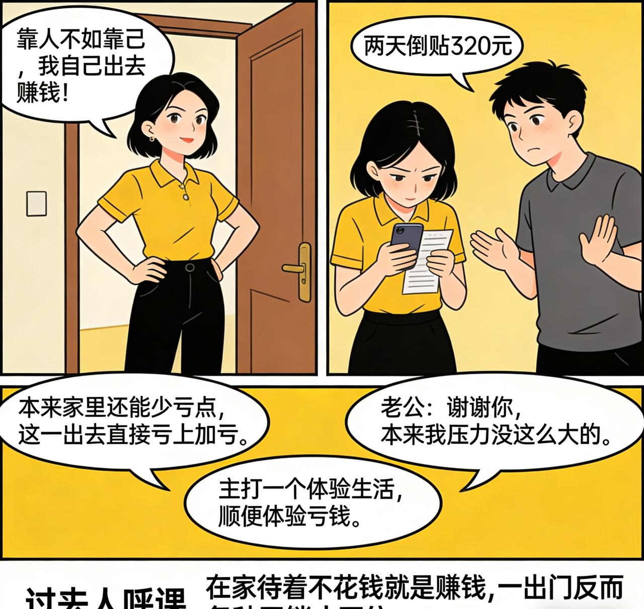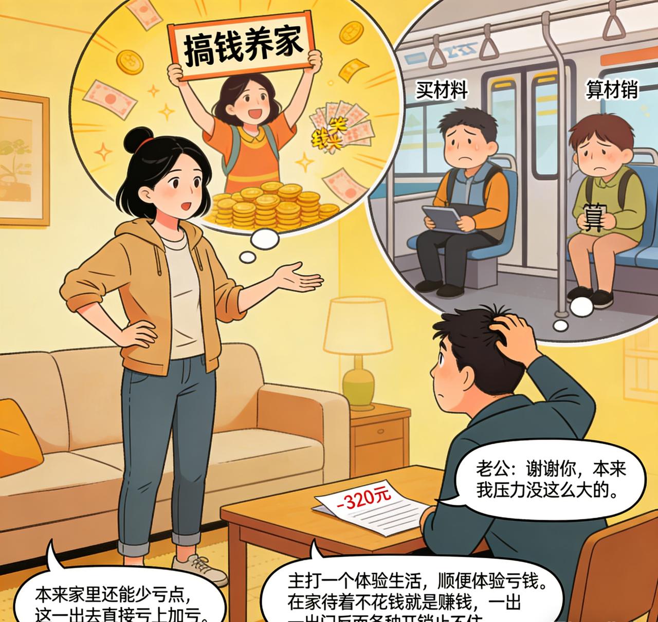 笑不活了!天津女子嫌老公挣钱少,非要出去赚钱,结果两天倒贴320元。 天津一女子最近越看老公越不顺眼,总觉得他赚钱太少、养家不给力,越待越憋屈,干脆一拍大腿:靠人不如靠己,我自己出去赚钱! 信心满满地出门找活干,又是找兼职又是跑活儿,本想着扬眉吐气一把,给家里多挣点生活费,顺便“教育”一下老公。 结果现实狠狠给了她一击: 两天折腾下来,不仅一分钱没挣到,车费、材料费、杂七杂八的开销一算,里外里还倒贴了320块。 回家一报账,夫妻俩当场哭笑不得。 本来是想出去“搞钱养家”,没想到先给自己添了笔亏损,网友纷纷调侃: - “本来家里还能少亏点,这一出去直接亏上加亏。” - “老公:谢谢你,本来我压力没这么大的。” - “主打一个体验生活,顺便体验亏钱。” 不少过来人也跟着吐槽:在家待着不花钱就是赚钱,一出门反而各种开销止不住。 生活有时候就是这么真实又好笑,理想很丰满,现实很扎心。对老公的埋怨 对老公吐槽 拿老公赚钱