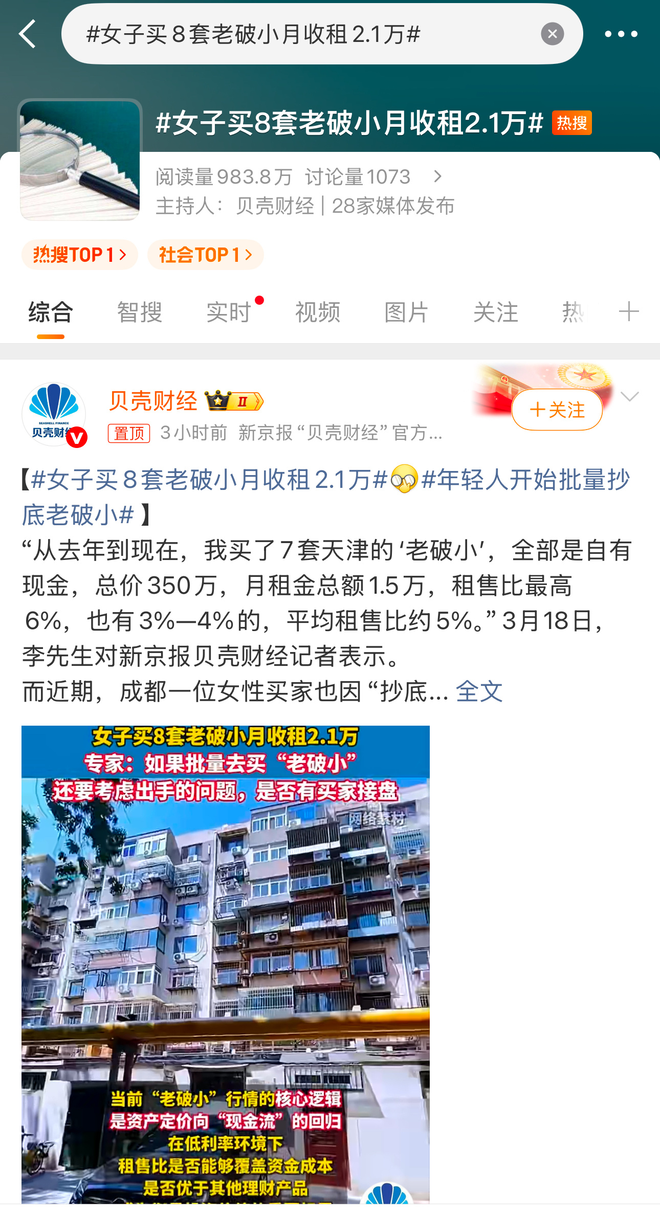 今天同时出现两个“老破小”的热搜?这是在推老破小吗?女子买8套老破小月收租2.1