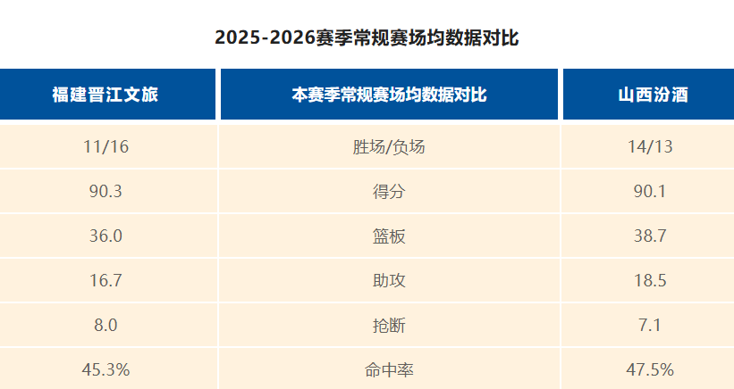 本赛季CBA常规赛第28轮,福建晋江文旅男篮将在主场迎战山西汾酒男篮,从攻防数据来看,山西汾酒男篮凭借场均38.7个篮板与更强的内线护筐能力占据体型优势,整体投篮命中率与团队传导更加稳定,同时在失分方面,山西汾酒男篮以87.6分位于联赛中上游;主队福建晋江文旅男篮场均得分略高于对手,但场均篮板处于联赛中下游,内线对抗与篮板保护对比山西汾酒男篮较为薄弱。