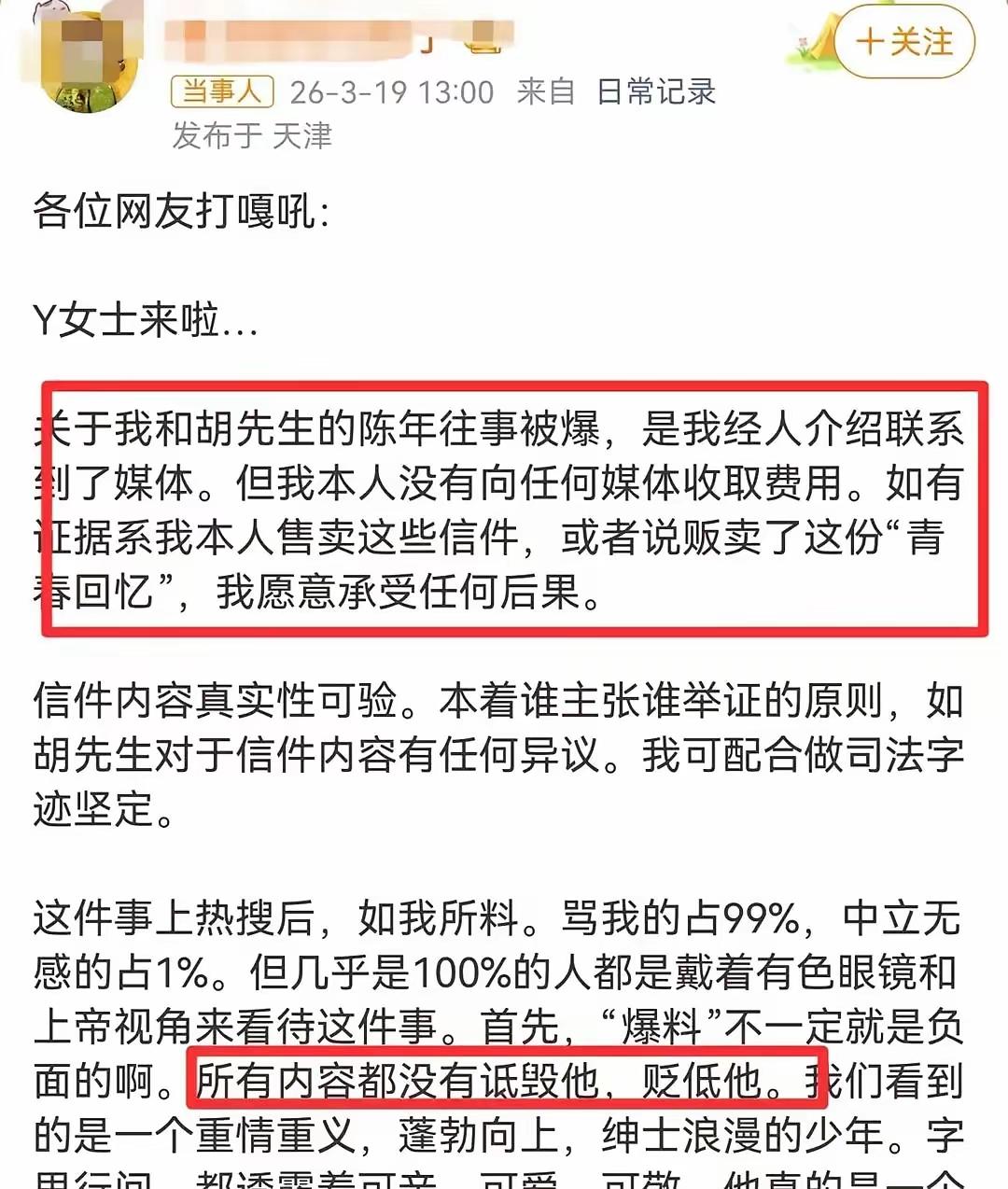 胡歌的初恋女友,亲自下场发文了! 3月19日下午,那位传说中的Y女士在社交平台上洋洋洒洒写了一篇长文,把最近闹得沸沸扬扬的信件曝光那点事儿,掰开揉碎了说清楚。 她说自己是经人介绍联系的媒体,没收一分钱,就是想把这层窗户纸捅开,把当年的事讲明白,绝对没有想蹭谁的热度。还特意强调,所有说出来的话,没有一句是抹黑胡歌的,纯粹是想把那段过往摊开来讲。 看完她那篇长文,说实话,我心里挺不是滋味的。 她说自己这些年挺憋屈的。就因为胡歌是大明星,而她自己就是个普通人,跟亲戚朋友提起当年和胡歌谈恋爱的事儿,没一个人信她。话里话外还带着点埋怨,说胡歌当年对她那么好,却从来没在任何场合提起过这段感情。最戳人的是她那句——连她七十多岁的老妈,在电视上看到胡歌,一眼就认出来了,这不就是闺女高中时候处的那小对象吗? 这话听着,确实让人心里一酸。 可网友们的反应也挺真实的。有人直接问:就因为别人不信你,四十来岁了跑出来曝光人家?也有人觉得,为了证明自己没吹牛,把人家二十多年前的私人信件翻出来,这份情谊到底还在不在,真不好说。 仔细想想也是。二十多年前的事了,那时候大家都是青涩少年,谈个恋爱,美好也好,遗憾也罢,留在心里当个念想,也挺好。现在突然摆到台面上来,不管初衷是啥,这个时间点,确实让人多想。 有些感情,放在心里,比拿出来说,更体面。 对于这事儿,你怎么看?来评论区聊聊。