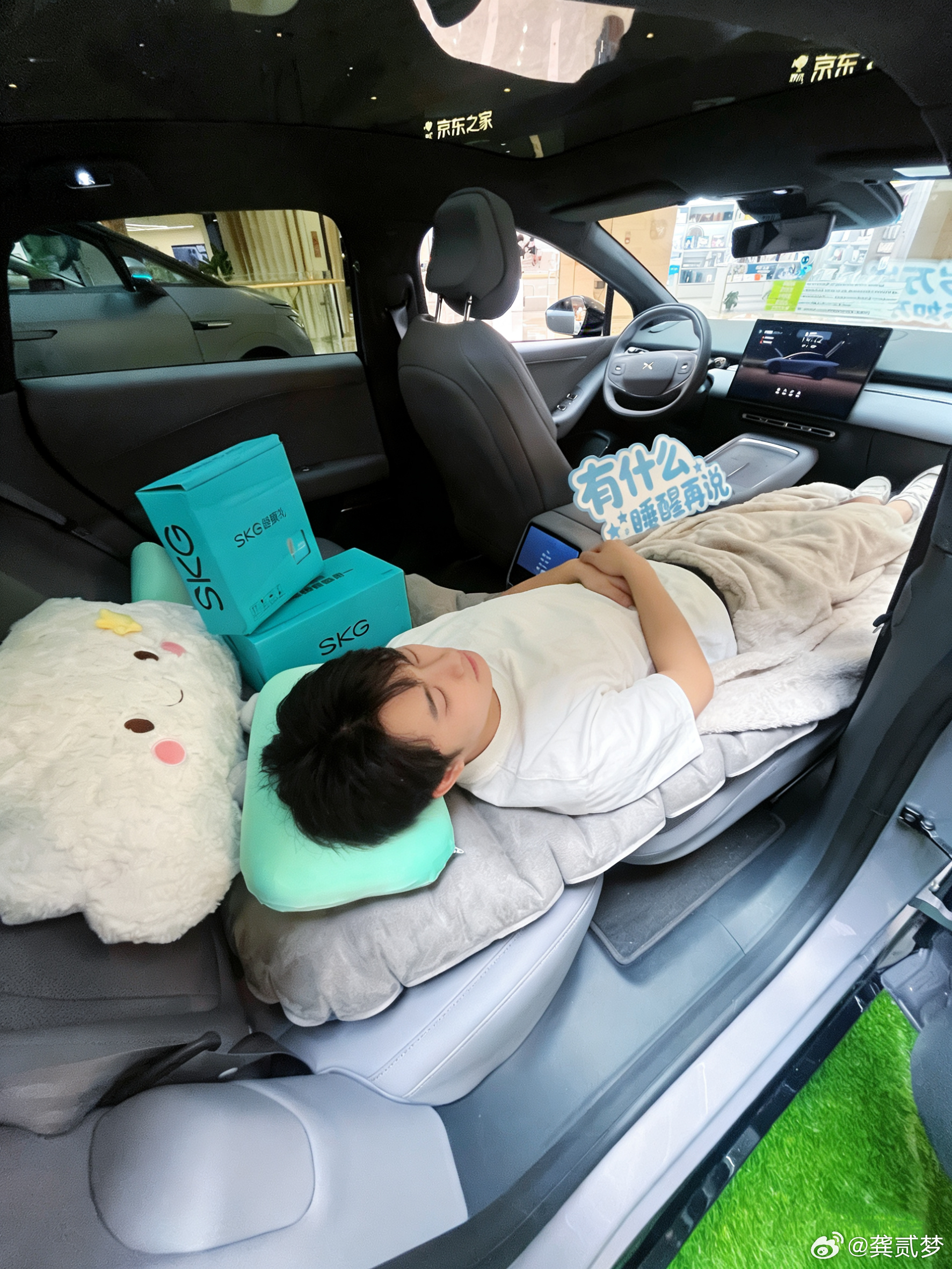 刚好明天就是世界睡眠日,小鹏P7+和SKG搞了个跨界联名,功能主打的就是小憩模式,别看只是放倒了座椅,但是空调的风量温度,香薰什么的都可以根据自己的习惯来搭配,这样一趟比趴着舒服多了。