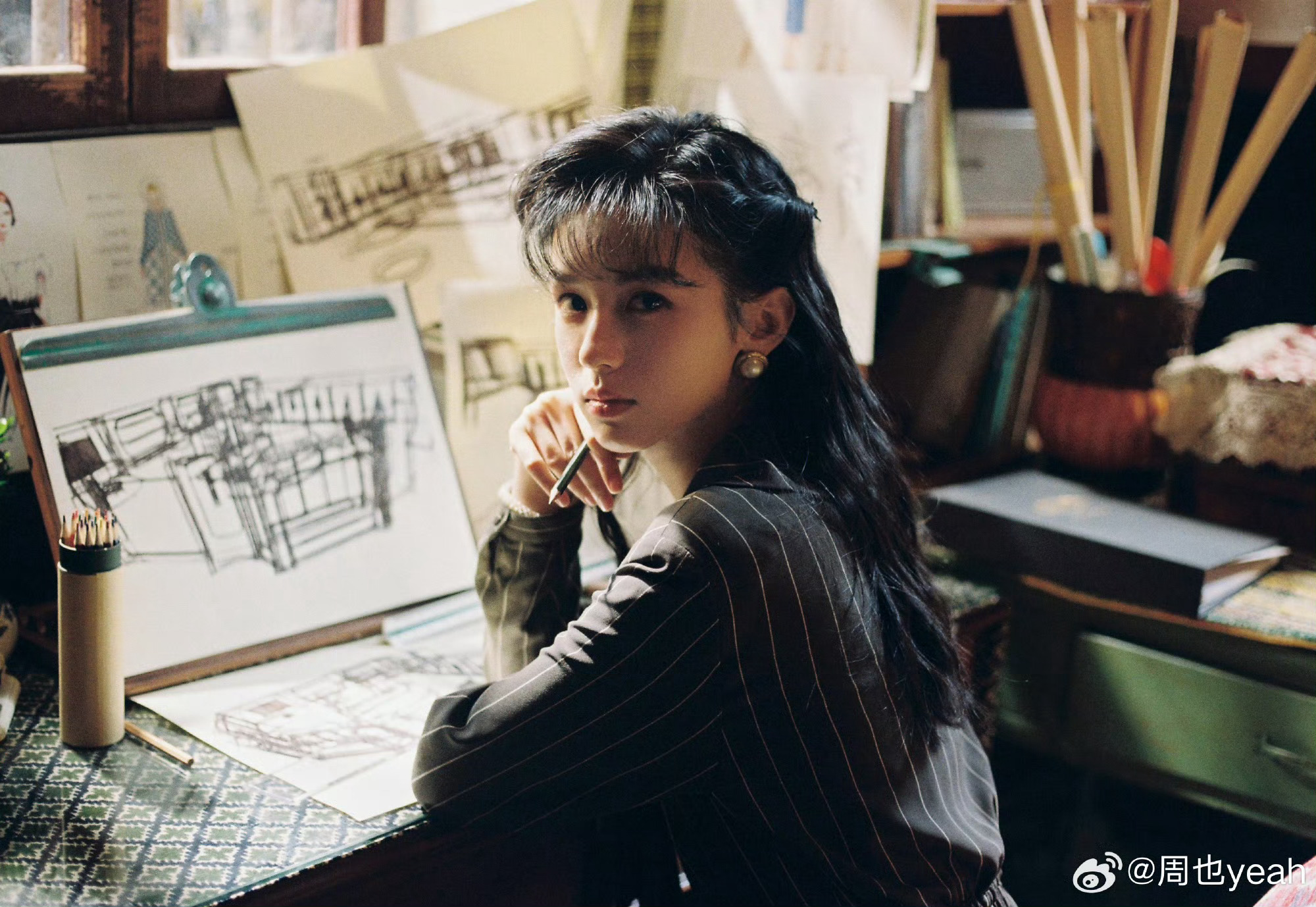 哇周也发了营业照,也太有年代感氛围了!港风条纹西装+温柔卷发,瞬间梦回80年代的画报美人✨每一帧都像老电影里的女主角,氛围感直接拉满了!