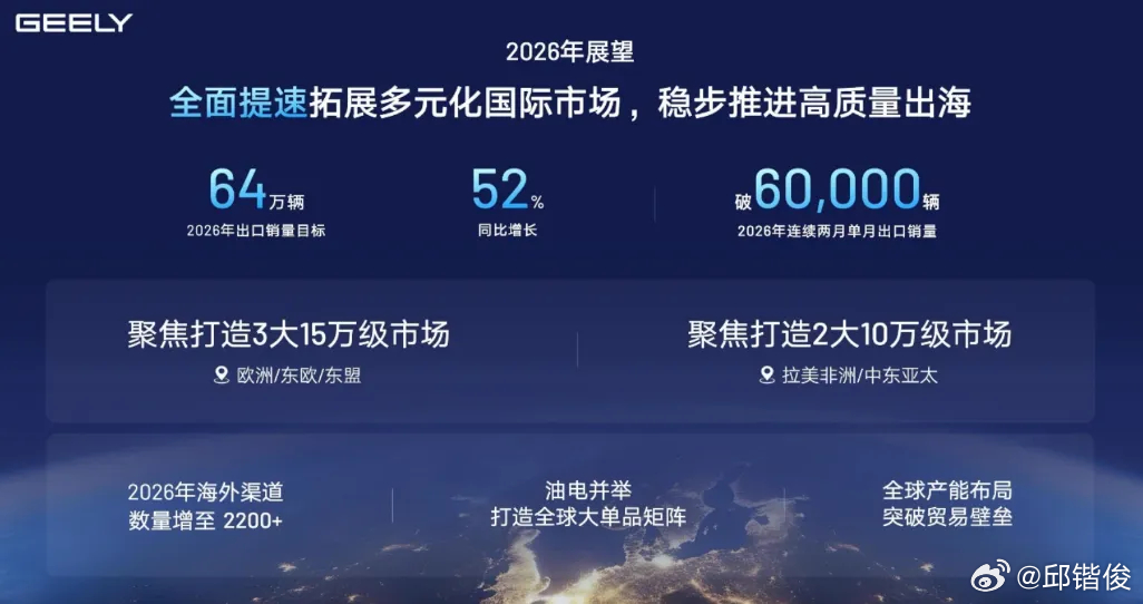 总体来说,无论国内国外,吉利汽车集团目前都是气势正盛,冲着榜首而去。淦家阅说,“2026年我们争取实现了在国内实现销量达到中国第一。海外我们还得继续加大投入,和我们的中国标杆企业缩短距离,向他们看齐。”