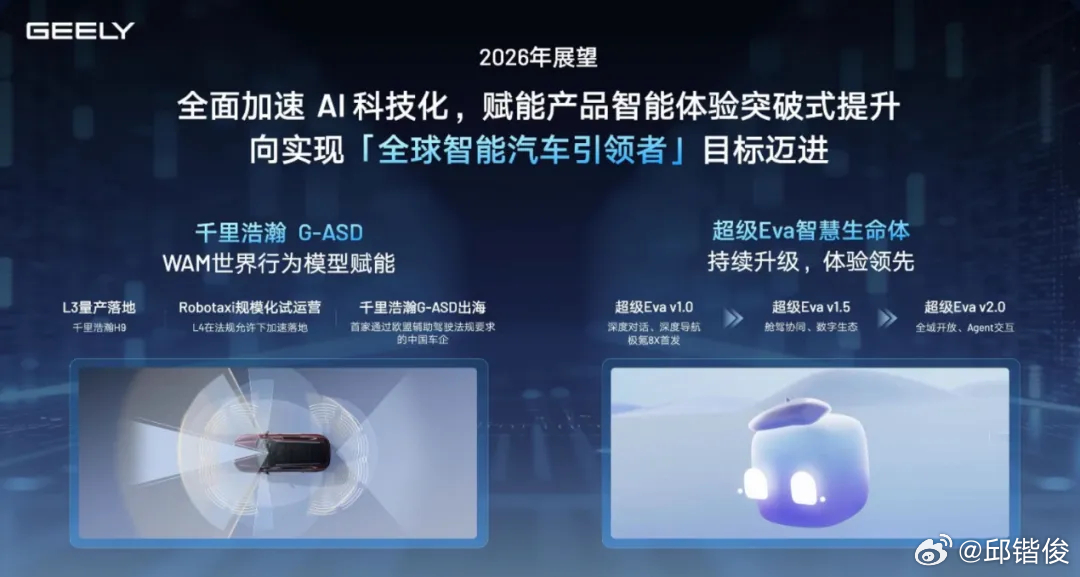 在AI基础设施上,吉利建设了全域AI技术体系,打造了WAM世界行为模型,架构对标特斯拉。在智驾方案上,吉利千里浩瀚G-ASD已跻身全球第一梯队,还成为中国首个获准出海的高阶辅助驾驶系统。智能座舱方面,2025年Flyme Auto上车量突破226万台,稳居国内座舱系统第一。第一季度吉利将发布超级Eva,将成为智能出行的AI助理。