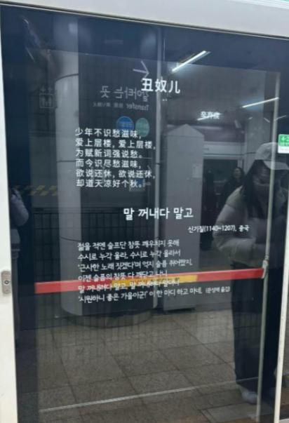 火到韩国了!一位中国游客去韩国旅游,准备乘坐地铁时,突然在展台的玻璃门上看到有汉字,开始还以为是提醒一类的,可上前仔细一看,竟然是辛弃疾的《丑奴儿》。网友:这个真建议效仿! 说白了,这事火得离谱,就是中国的千古诗词,反倒在韩国地铁站成了显眼包,反观我们自己,却还有人在瞎反思,实在让人摸不着头脑。 最近刷到一个视频,越看越有意思,一位中国游客去韩国首尔旅游,逛累了准备坐地铁歇一歇,刚走到站台玻璃门跟前,眼角余光瞥见上面有汉字,一开始还没当回事,心想顶多就是个安全提醒,比如“小心夹手”“请勿倚靠”之类的,毕竟在国外看到零星汉字,大多都是这类实用提示。 可他越看越不对劲,凑上前仔细一瞅,直接愣住了——这哪是什么提醒,分明是辛弃疾的《丑奴儿》,“少年不识愁滋味,爱上层楼”一句清清楚楚,下面还配着韩文翻译,连辛弃疾的名字都标注得明明白白。 这事儿一火我就忍不住多想,要是反过来,在中国的橱窗上贴着日本、韩国甚至美国的诗词,哪怕只是一句普通的句子,我感觉大概率不等多数人看见,这个橱窗的玻璃就得被清理得干干净净,连一点痕迹都留不下。 不是我夸张,大家可以回想一下,我们对这类外来文化的展示,向来都很谨慎,更别说把外国诗词贴在公共场所,估计刚贴上去就会被质疑,很快就会被撤掉。 更有意思的是,韩国这操作,跟他们之前限制汉字的做法比起来,简直反差拉满。我了解到,韩国为了所谓的“民族认同”,前后搞了三次大规模的“废汉字”运动,最激进的时候,小学直接停开汉字课,古建筑匾额、钱币上的汉字都要换成纯韩文,硬生生把沿用了上千年的汉字往外推。 据说现在不少韩国70后、80后,都成了“汉字文盲”,连自己身份证上的汉字名都认不全。 说句实在的,这么做真有点小肚鸡肠,汉字陪伴他们上千年,早就融入了他们的文化里,非要硬生生切割,连自己的文化根基都不顾,反倒把我们的诗词贴在地铁站,想想就觉得挺讽刺。 最让我不解的是,这事儿下面居然还有反思怪跳出来,说什么“没必要这么骄傲”“贴个诗词而已,别太上头”。 我就纳闷了,怎么什么事都有反思怪?这些诗词不是刻在我们国人的骨头上、流淌在血液里的东西吗? 从小我们就跟着老师读唐诗宋词,辛弃疾、李白、杜牧的作品,哪个不是张口就来、出口成章? 从小学到初中,课本里翻来覆去都是这些经典,这是我们刻在骨子里的文化底气,让你从小学习、铭记的知识,有什么好嫌弃、好反思的? 据说现在去首尔那几个地铁站,打卡中国诗词已经成了不少中国游客的必做事项,还有韩国网友表示,通过这些诗词,慢慢了解到了中国古典文化的魅力。 其实这本来就是一件很简单的事,就是文化的自然传播,没必要过度解读,也没必要瞎反思。 以上仅代表我个人看法,不评价这件事本身,也不刻意拔高什么,大家觉得韩国这波操作值得效仿吗?欢迎在评论区说说你的想法。